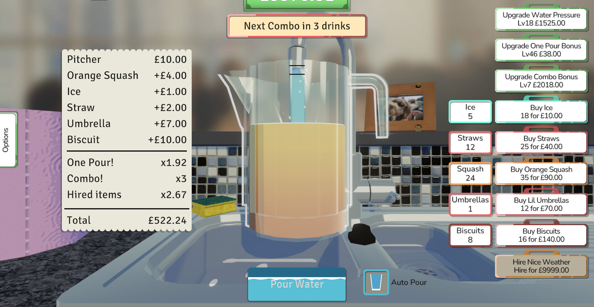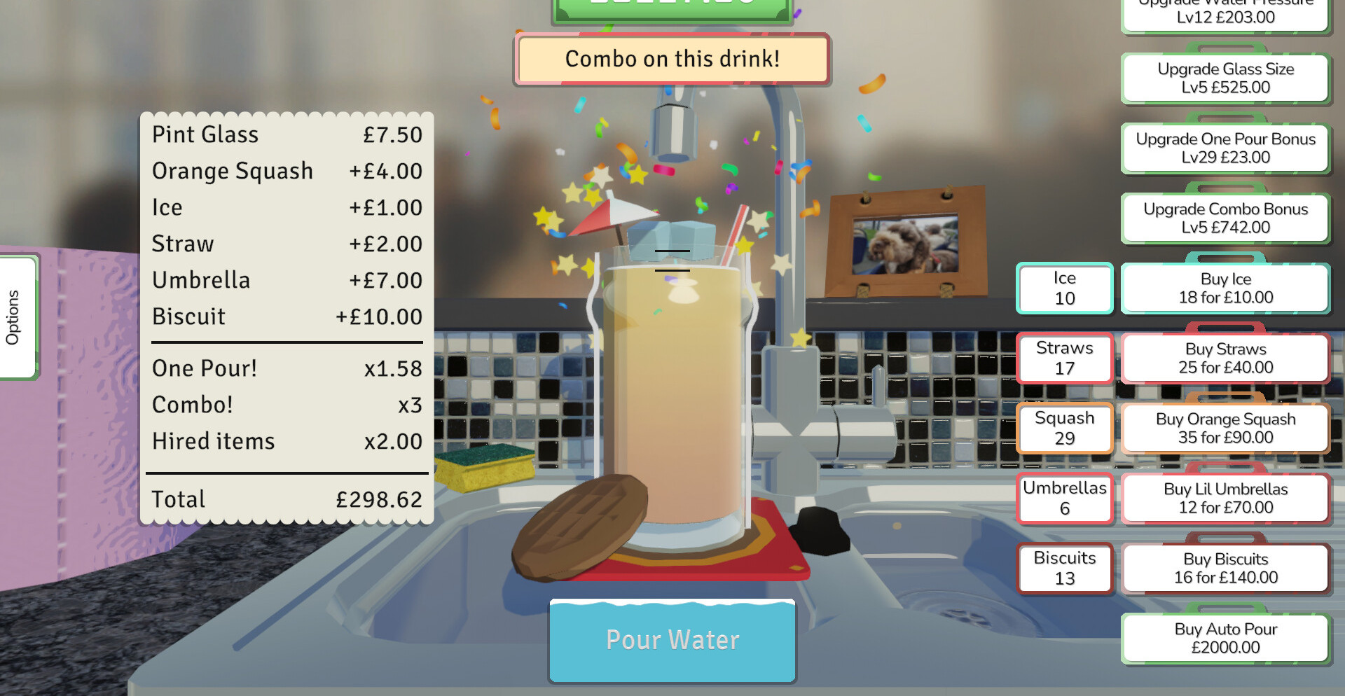 Процесс строится вокруг точного заполнения стаканов, где важно остановиться в нужный момент. Перелив ведёт к проблемам, а аккуратность даёт бонусы, поэтому приходится балансировать между риском и выгодой. Чем увереннее действия, тем быстрее растёт доход, превращая простую механику в напряжённое занятие.