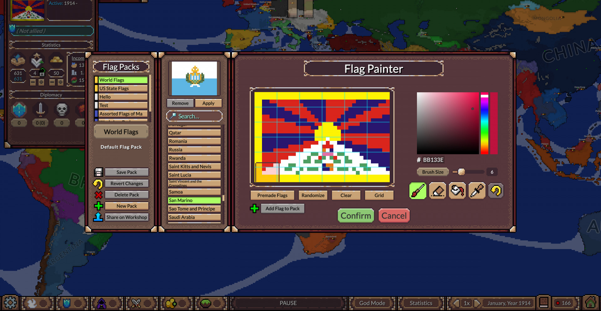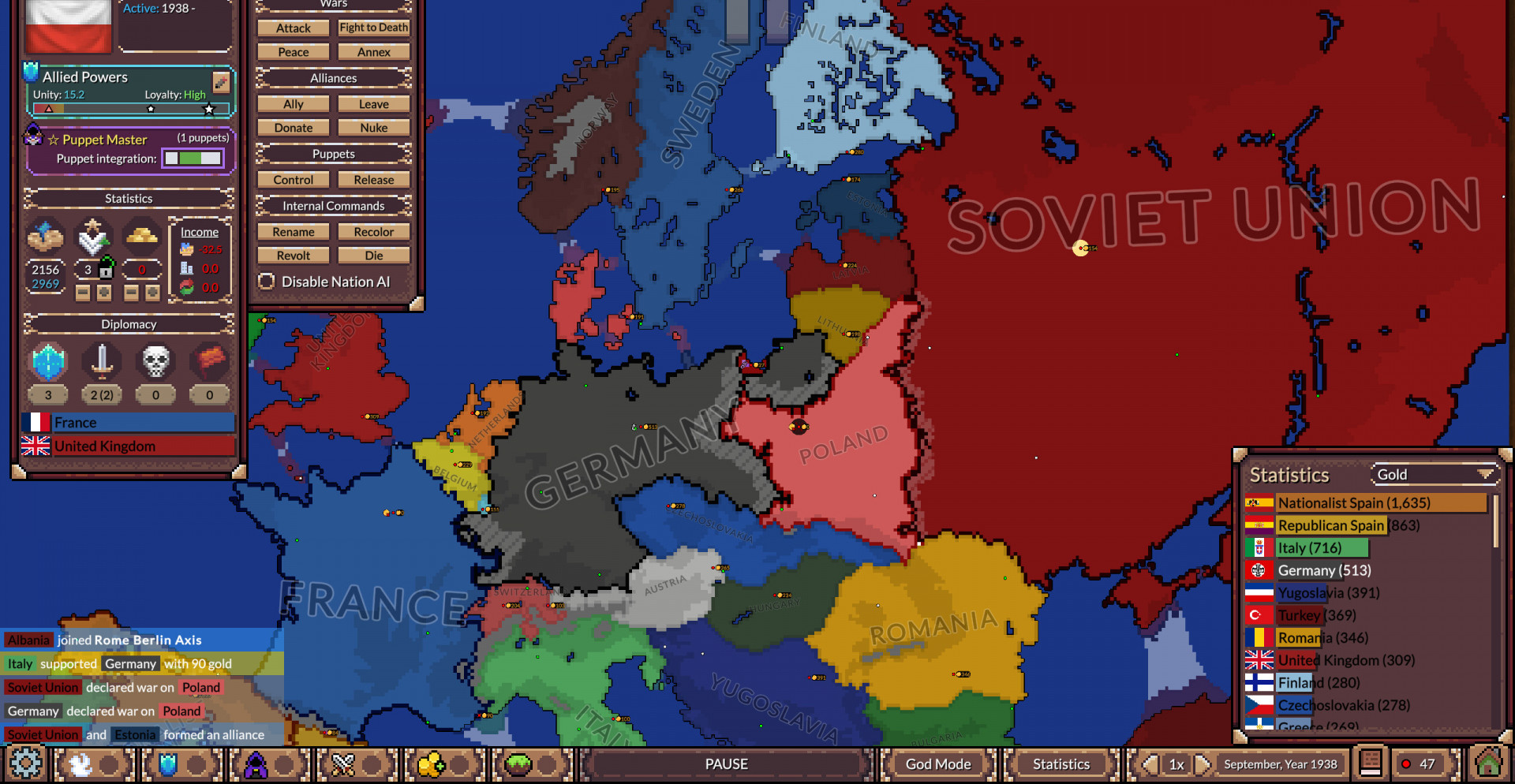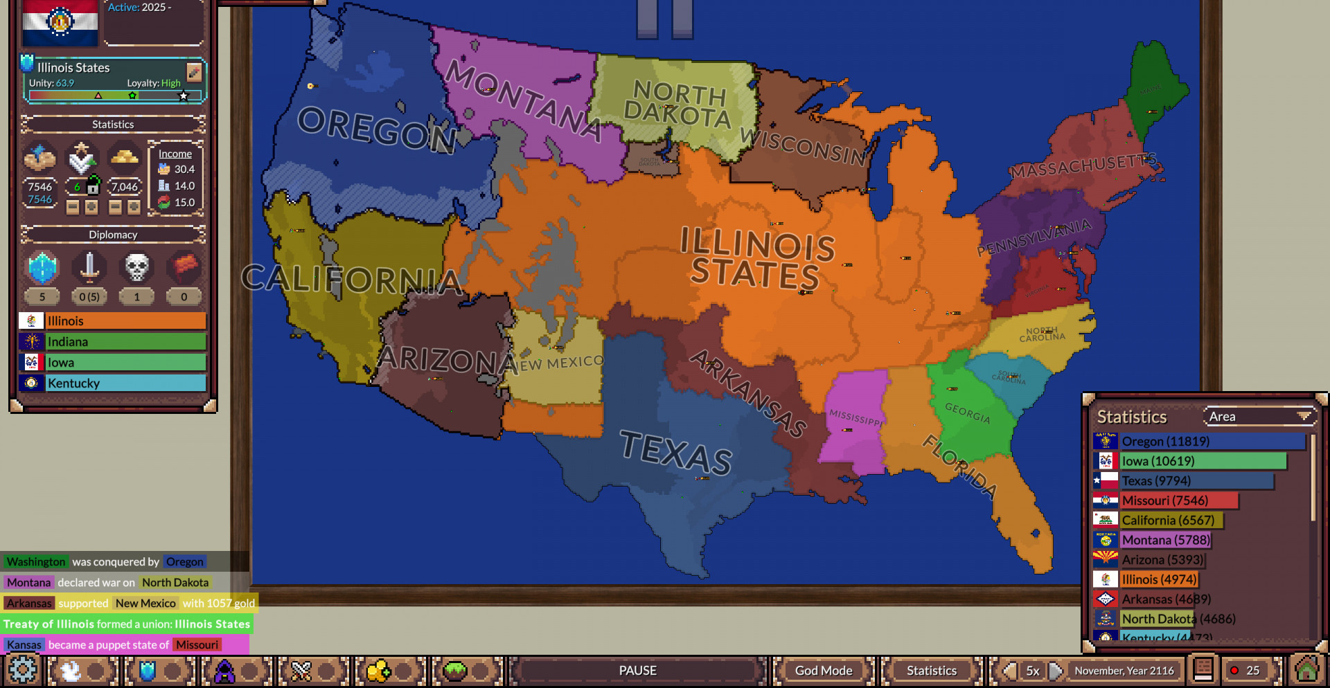 Инструменты режима Бога позволяют в любой момент вмешаться в происходящее. Вы можете менять границы, усиливать или ослаблять нации, корректировать ландшафт и параметры поведения ИИ. Это превращает симуляцию в эксперимент, где одно изменение способно переписать судьбу целого континента на сотни или тысячи лет вперёд.