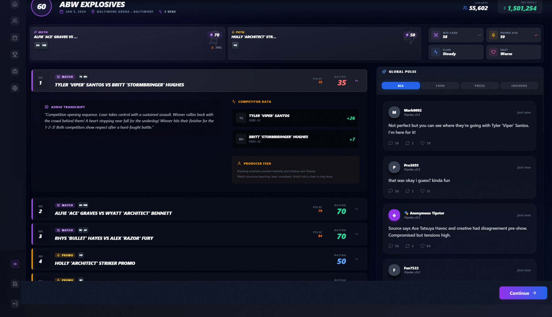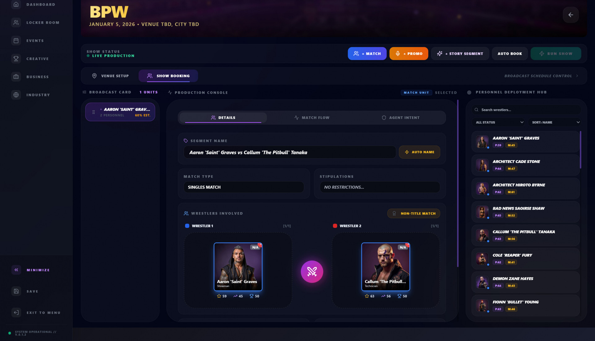Создание шоу строится вокруг детального контроля. Матчи формируются пошагово: стиль, темп, защита и ключевые моменты напрямую влияют на реакцию аудитории и состояние рестлеров. Промо-сегменты не имеют заранее заданных исходов — они развивают конфликты и персонажей в зависимости от ситуации и накопленного напряжения.