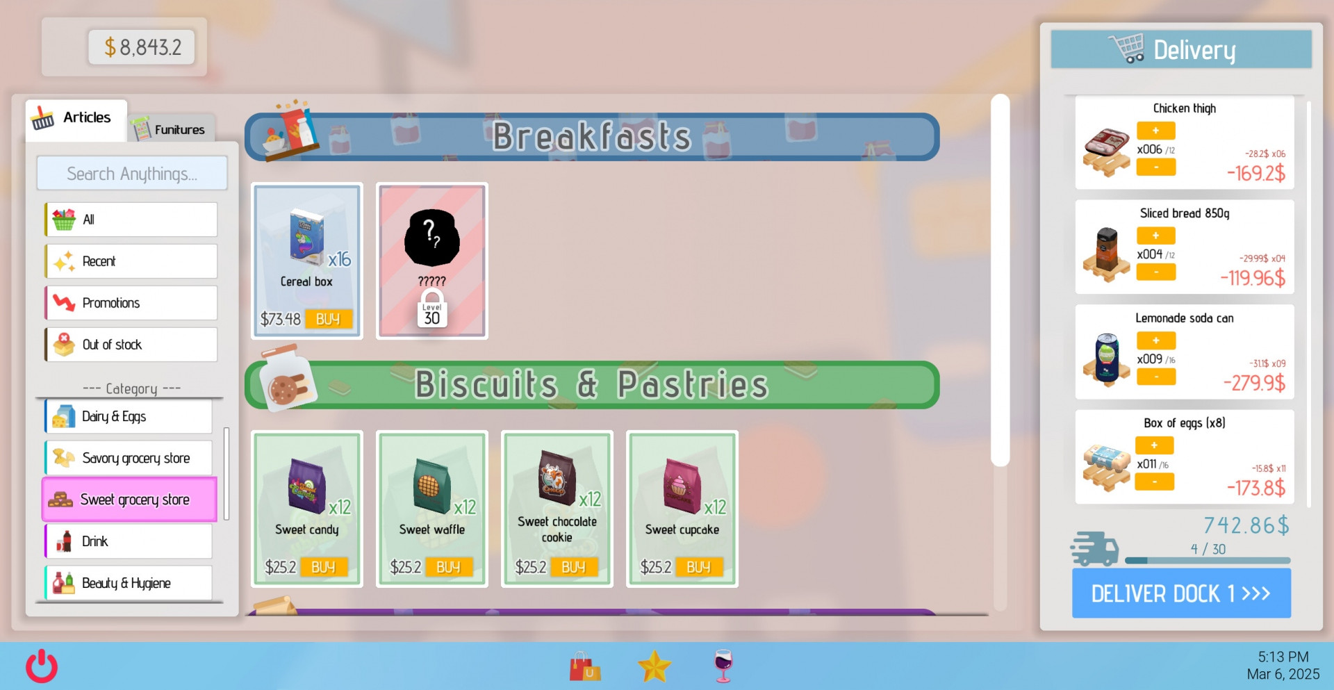 Нанимайте персонал, улучшайте оборудование и повышайте скорость обслуживания на кассах. Расширяйте бизнес, открывая новые отделы, такие как пекарня или отдел электроники, чтобы привлечь ещё больше покупателей.