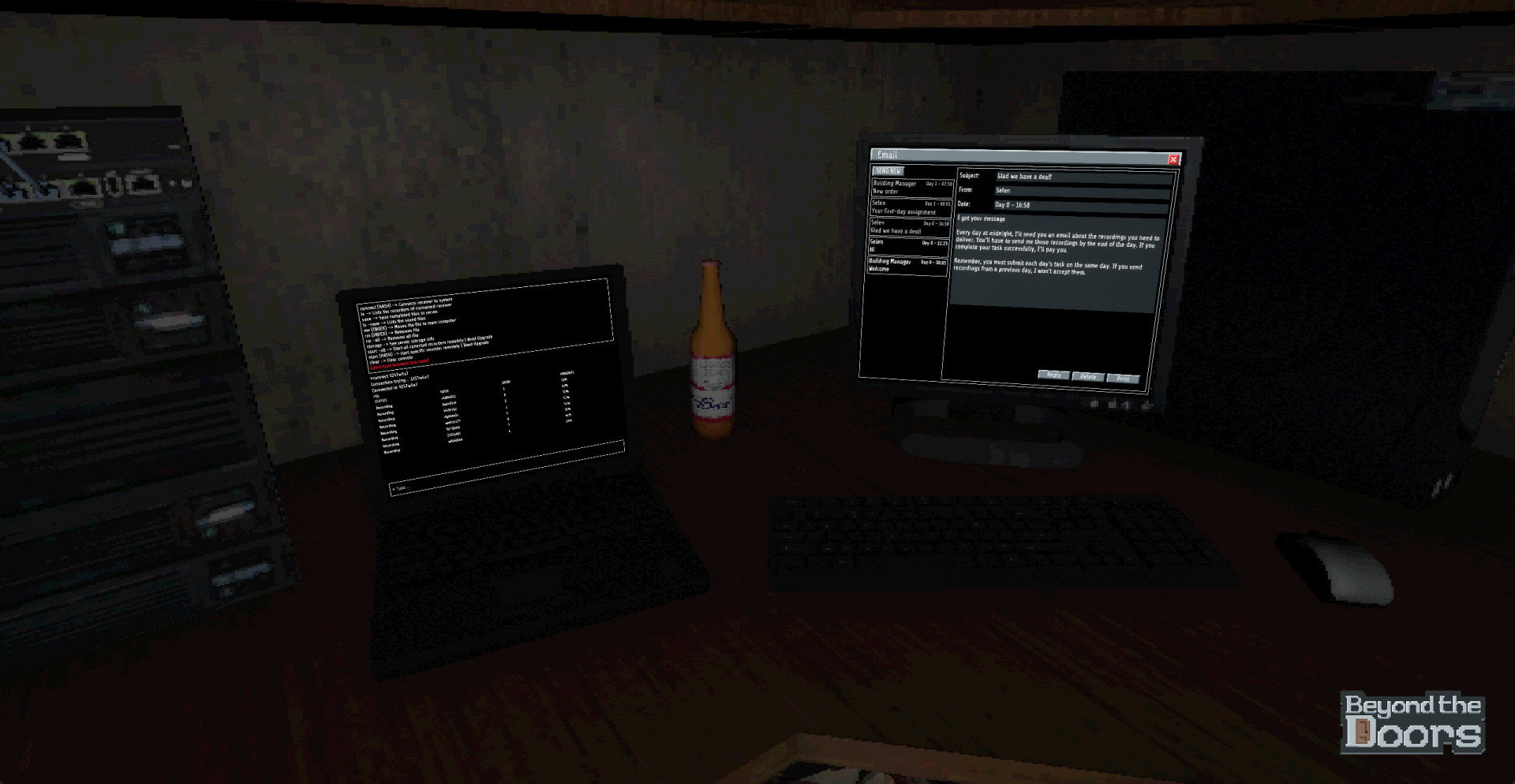Beyond the Doors — это атмосферное исследование от первого лица, где вы обитаете в тусклом подвальном офисе и каждую ночь следите за соседями, исчезающими за закрытыми дверями. Вы не знаете, что происходит в их квартирах, но собираете любую крупицу информации. Работа начинается после наступления тишины: звуки становятся данными, а данные — источником дохода и контроля.