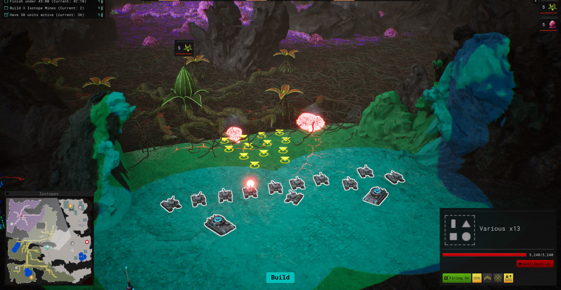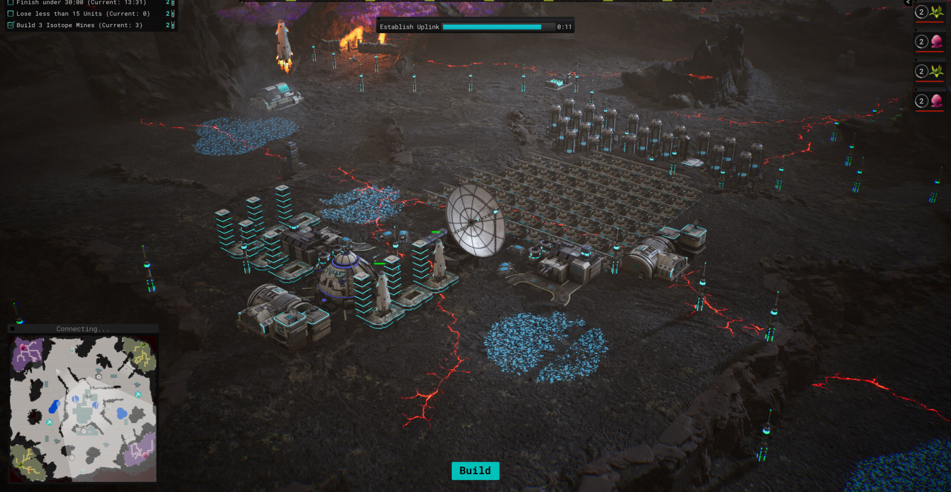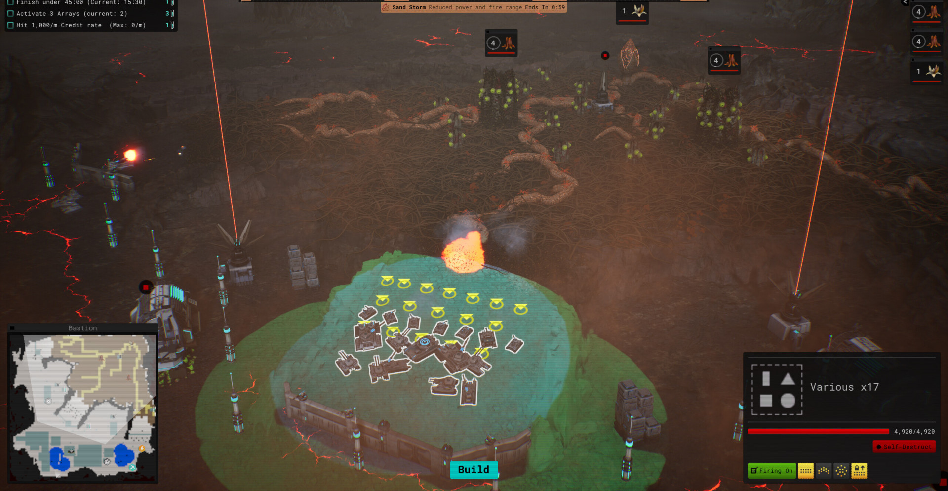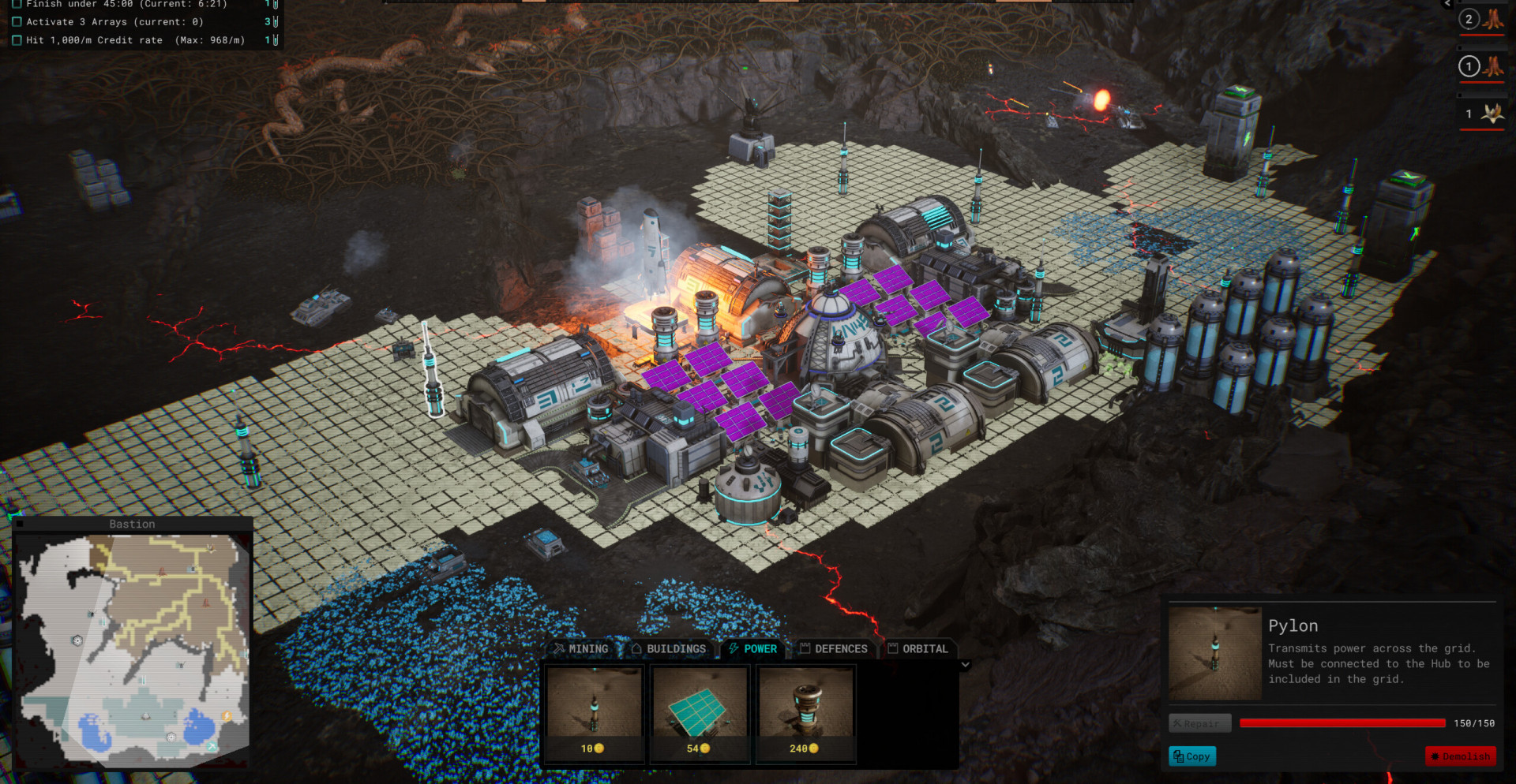 База строится вокруг энергетической инфраструктуры и добывающих узлов. Энергия питает сборщики, перерабатывающие комплексы и оборонительные сооружения, поэтому сбои в системе сразу ослабляют защиту. Отправка обработанной руды на орбиту приносит кредиты, которые используются для расширения производства, возведения стен и размещения турелей.