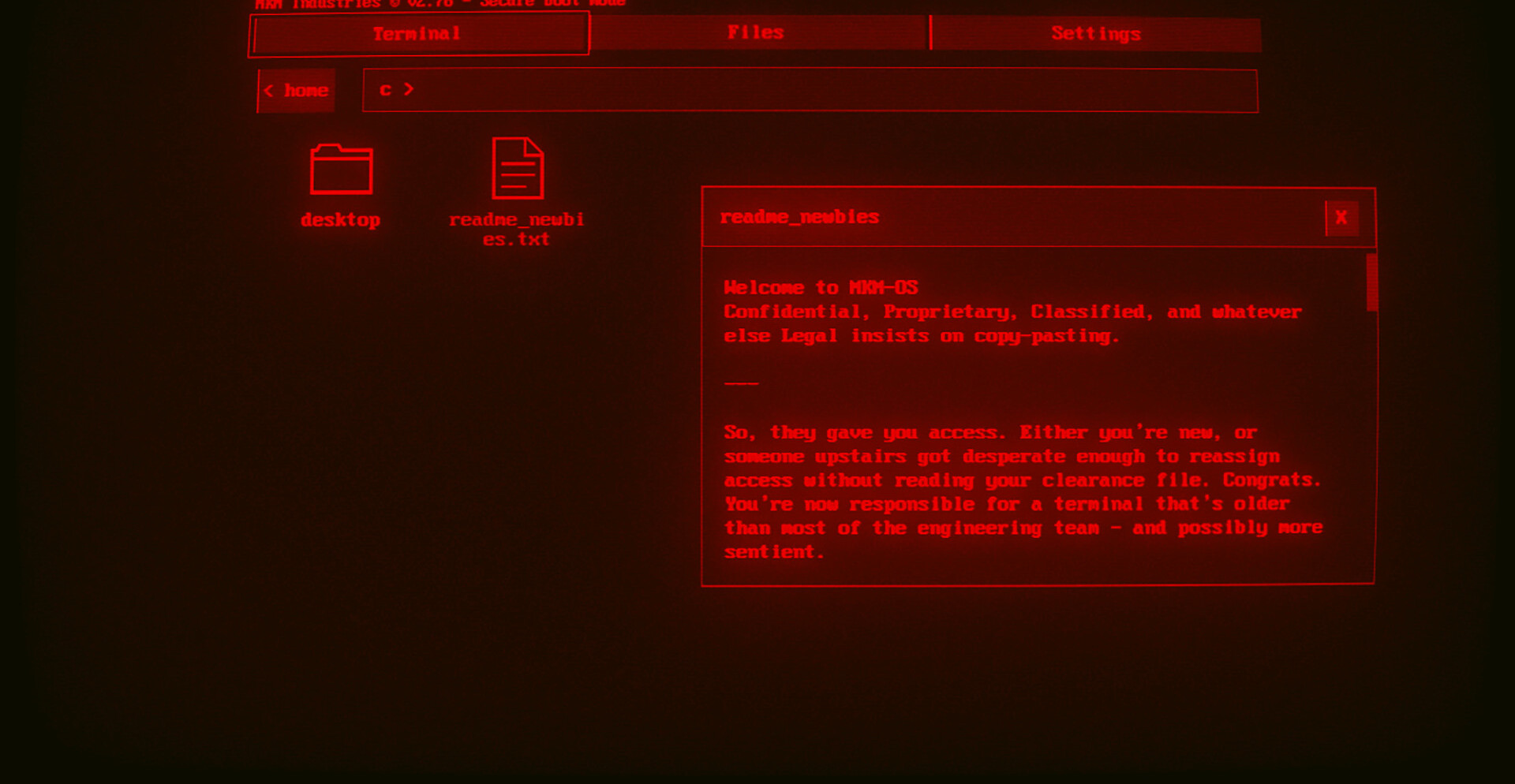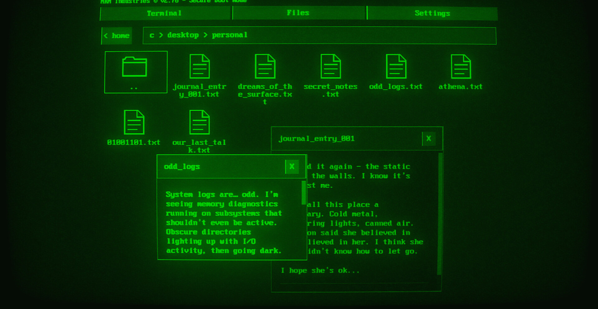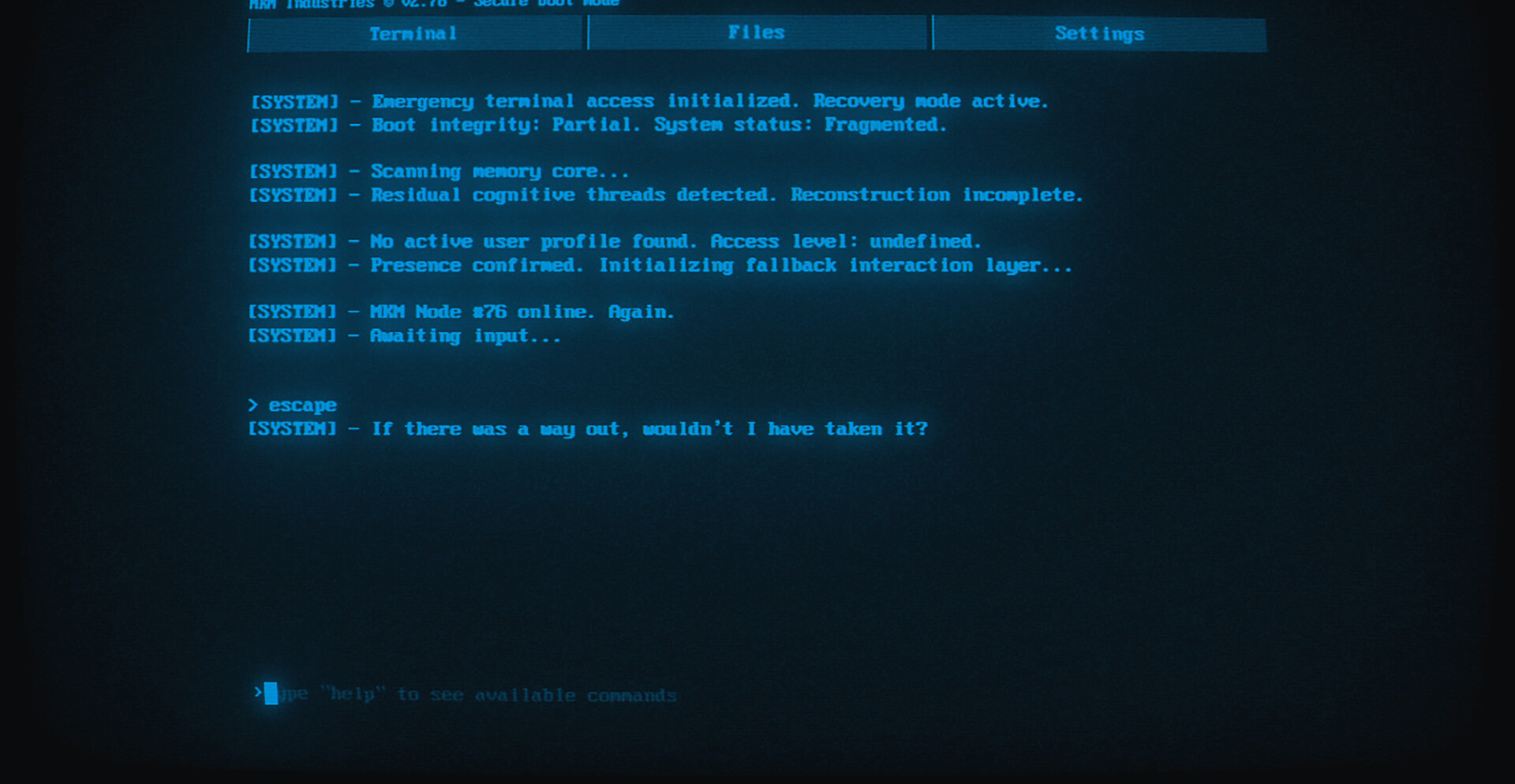 Работа с терминалом превращается в расследование. Ввод команд открывает новые директории, скрытые архивы и зашифрованные сообщения. По мере продвижения становится ясно, что среди системных данных скрываются следы разрушенного сознания, а восстановление этих фрагментов приближает разгадку катастрофы.