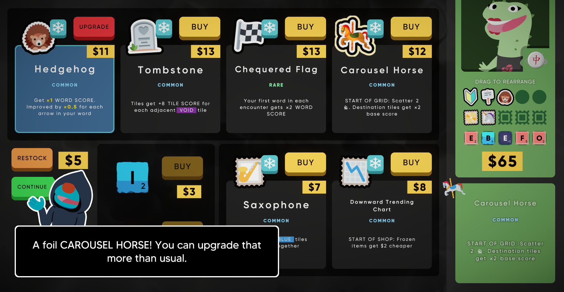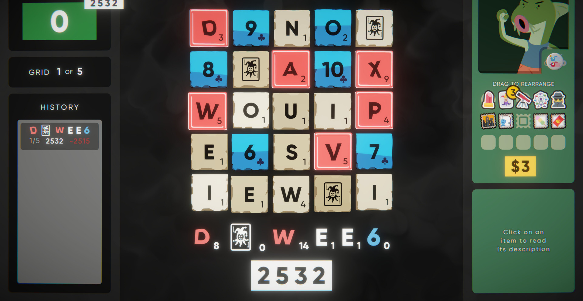 Каждый этап состоит из серии столкновений и боя с боссом, где необходимо набирать очки через комбинации букв и эффектов. Стикеры и модификаторы позволяют менять правила прямо во время прохождения: усиливать отдельные буквы, дублировать эффекты или полностью ломать привычную логику построения слов. В какой-то момент стандартный подход перестаёт работать, и приходится искать нестандартные решения, чтобы продолжать прогресс.