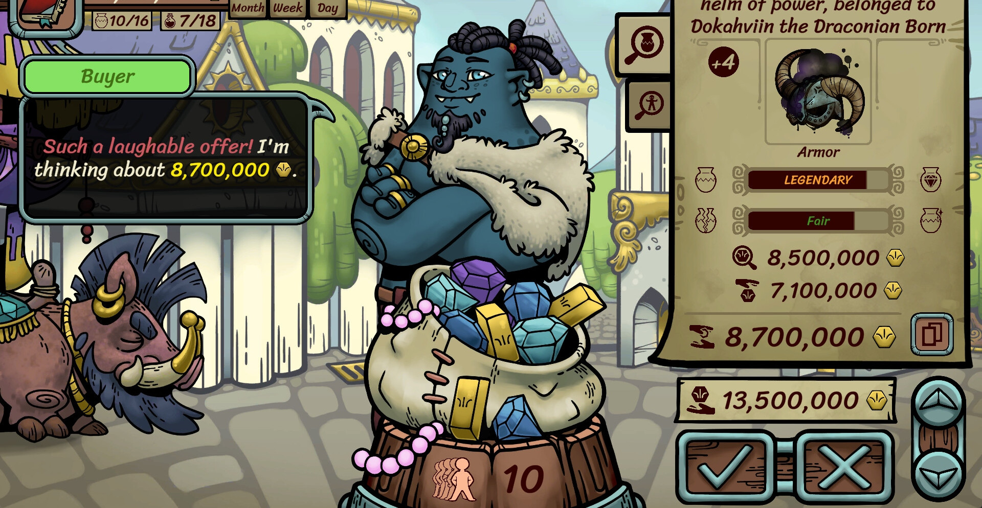 Вы шагаете от города к городу с мешком барахла и мечтой о богатстве. Каждый клиент — ходячая загадка: обмануть, купить подешевле, продать подороже. Иногда это древний маг, иногда — парень в капюшоне с "настоящим" легендарным мечом. Проверь, прежде чем брать.