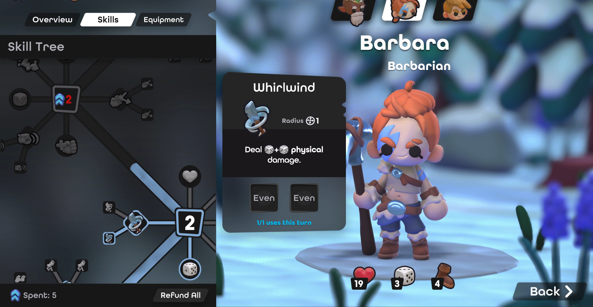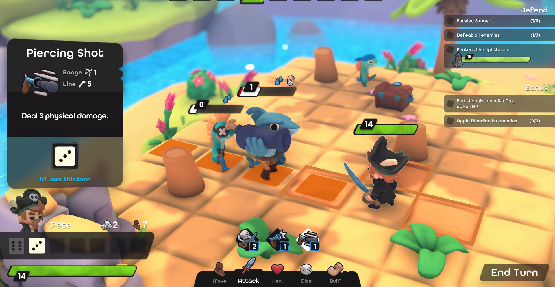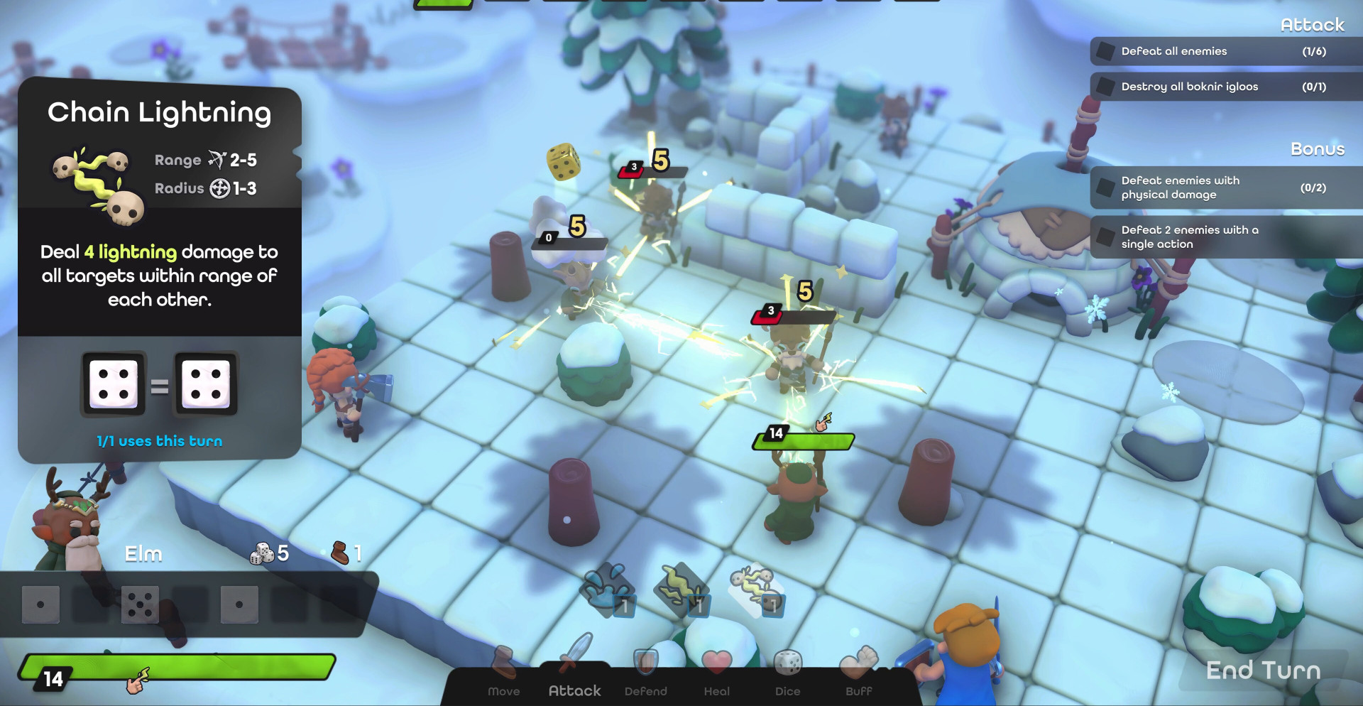 В начале каждого хода персонажи получают набор кубиков, которые используются для выполнения всех действий. В игре отсутствует вероятность промаха — если нужная комбинация доступна, действие срабатывает гарантированно. Это смещает акцент с удачи на планирование, заставляя адаптировать стратегию под выпавшие значения и порядок ходов.