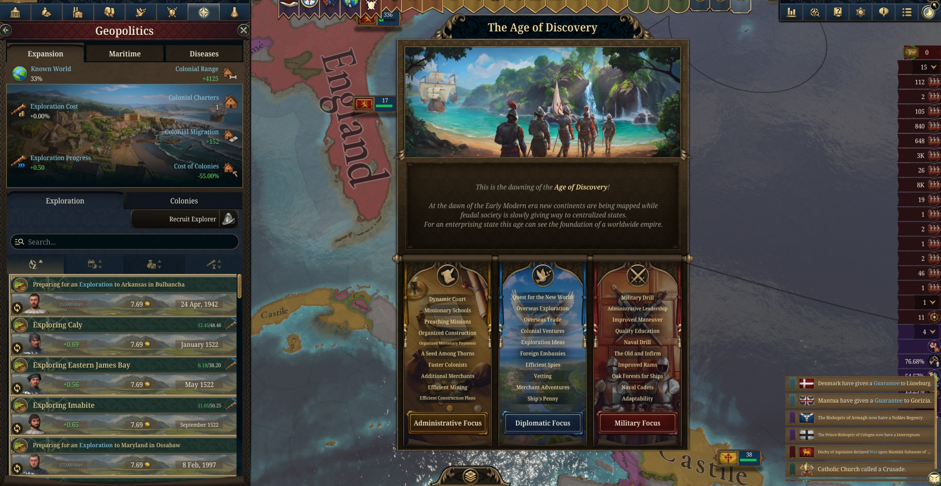 Начните с малого — с племени, города-государства или разбросанного княжества — и доведите свою страну до великой державы. Развивайте технологии, направляйте учёных в экспедиции и первыми открывайте новые материки. Исследование мира — ключ к вашему процветанию. С каждым новым открытием появляются уникальные возможности, от колонизации до глобальных реформ.