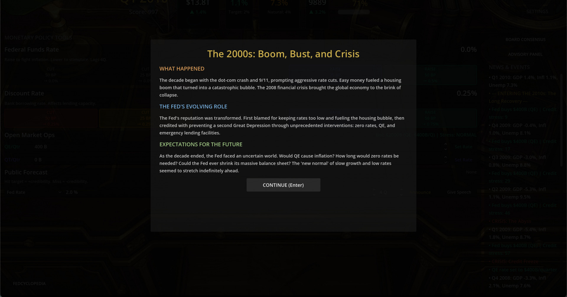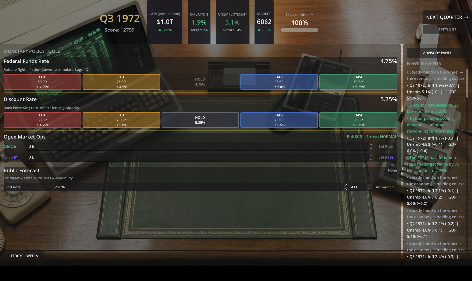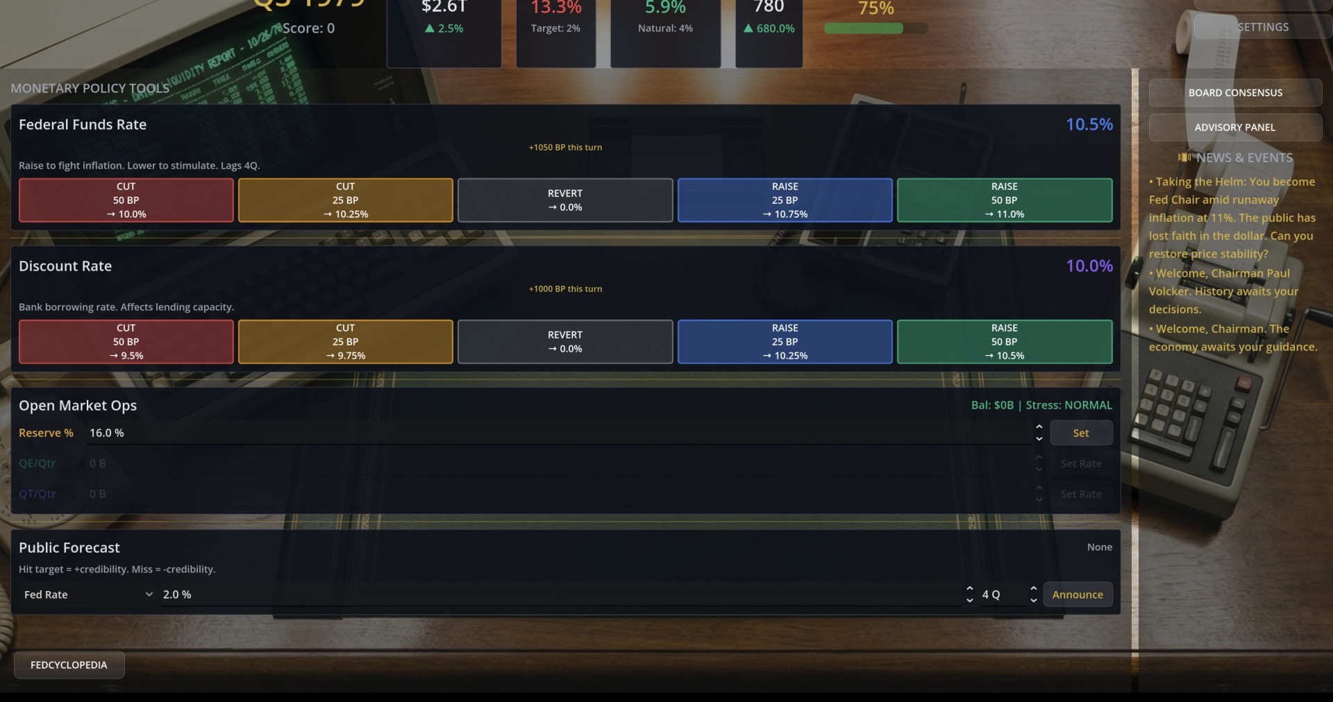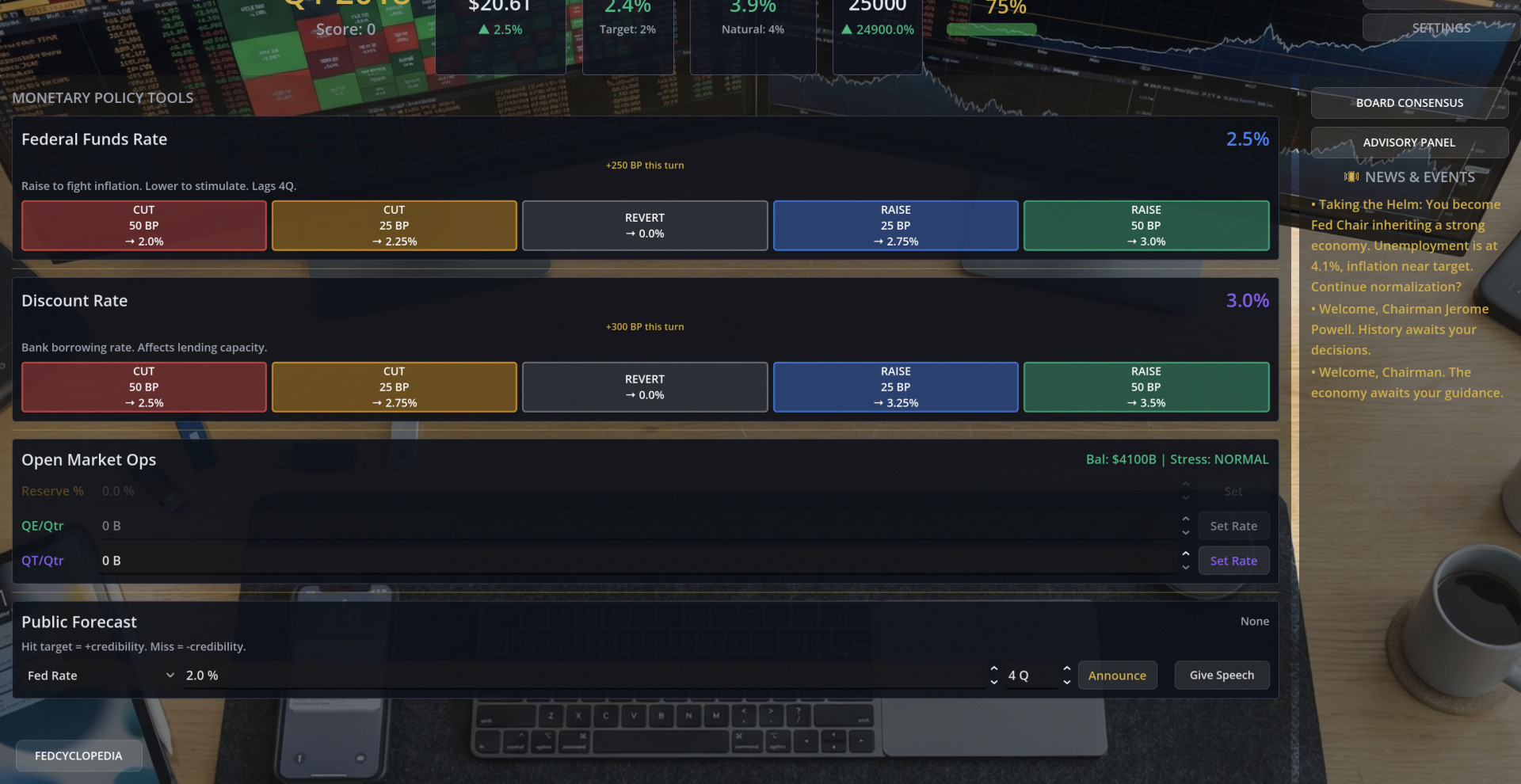Federal Reserve Simulator — это стратегический симулятор, где управление крупнейшей финансовой системой превращается в цепочку сложных решений с отложенными последствиями. Каждый шаг влияет на экономику не сразу, а спустя время, поэтому приходится учитывать долгосрочные эффекты и просчитывать риски. Баланс между инфляцией, ростом и стабильностью становится главной задачей.
