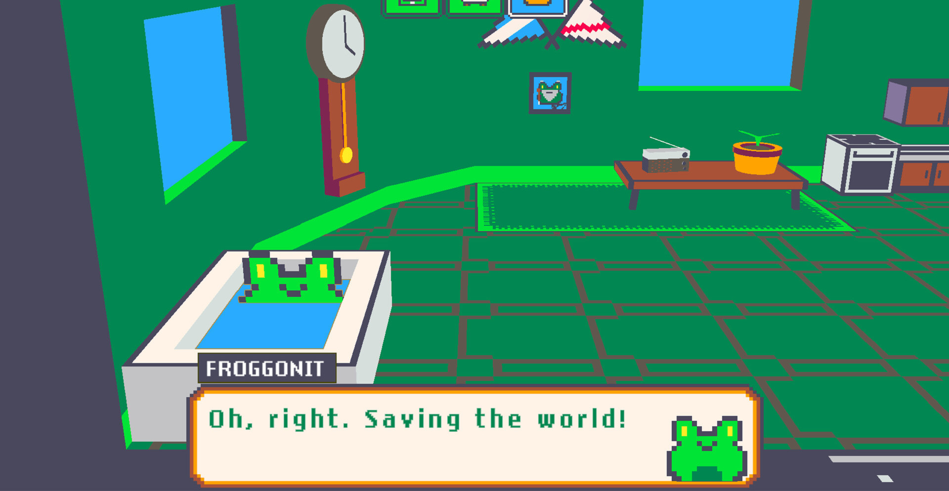 FROGGONIT — это яркое приключение с исследованием и юмором, где любопытная лягушка случайно выпускает силу, погрузившую весь остров во тьму. Мир, населённый дружелюбными животными, оказывается в беде, и теперь именно вам предстоит исправить собственную ошибку. Прыгайте по острову, ищите секреты и помогайте его обитателям вернуть свет и порядок.
