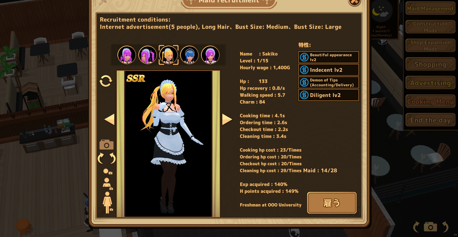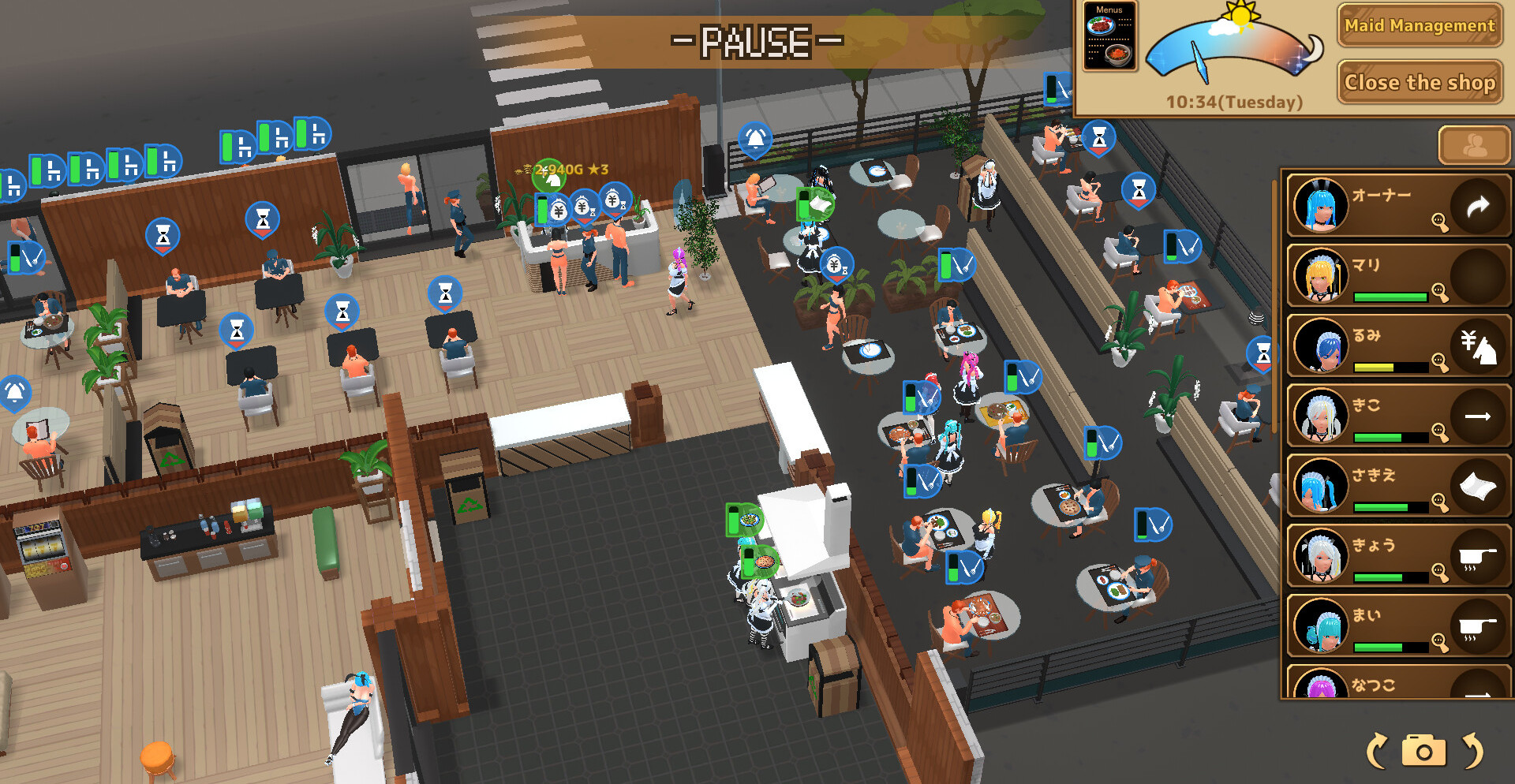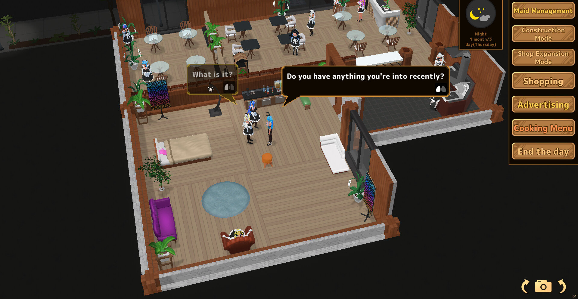 Дневной цикл посвящён управлению заведением: обслуживанию гостей, распределению задач и получению прибыли. По мере роста доходов открываются возможности для найма новых горничных и автоматизации процессов, что позволяет расширять кафе и повышать эффективность. Каждое решение влияет на темп развития и общий комфорт работы.