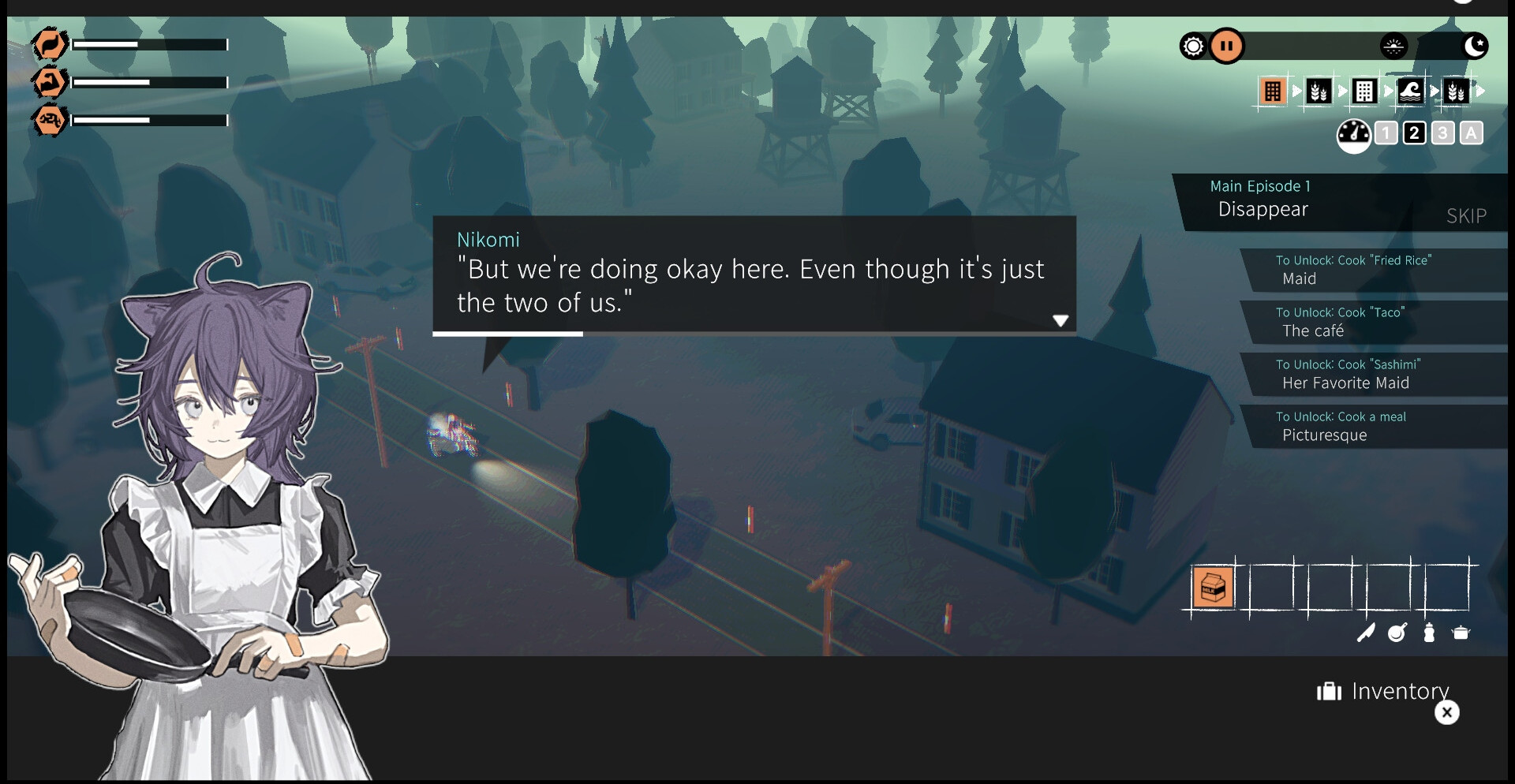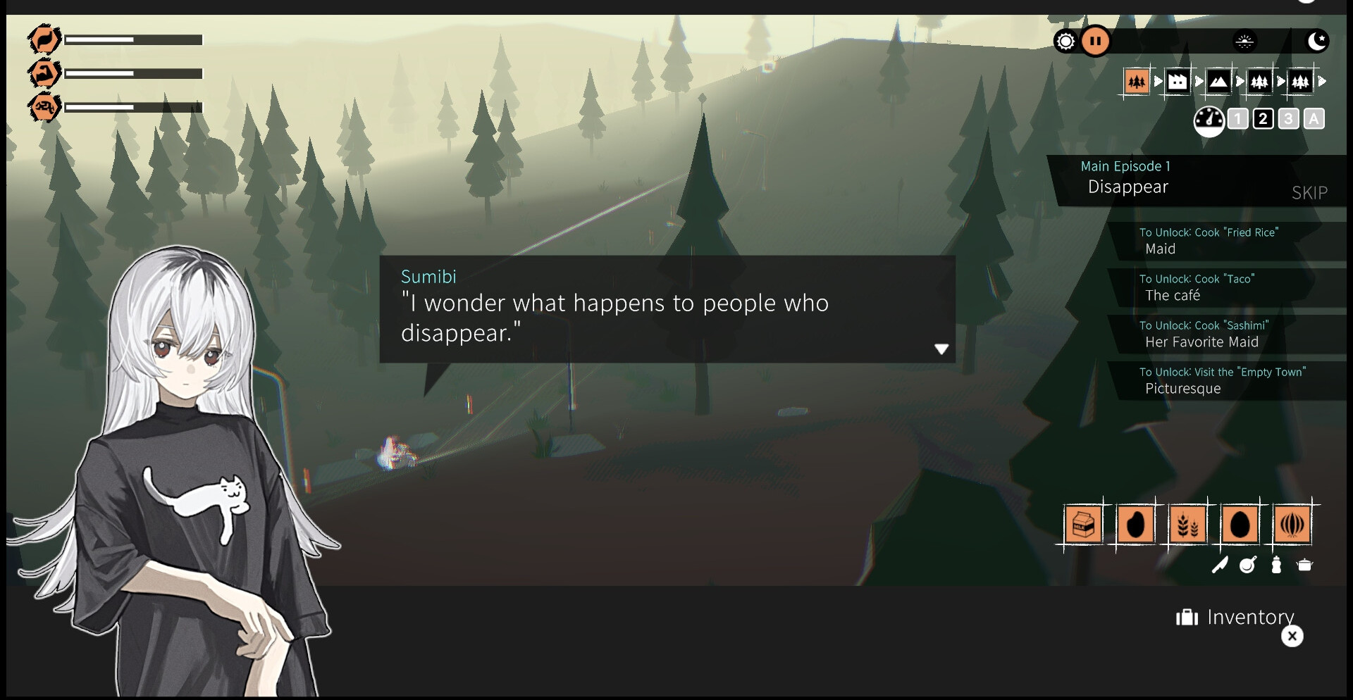 Сбор ресурсов и приготовление еды для поддержки персонажей.