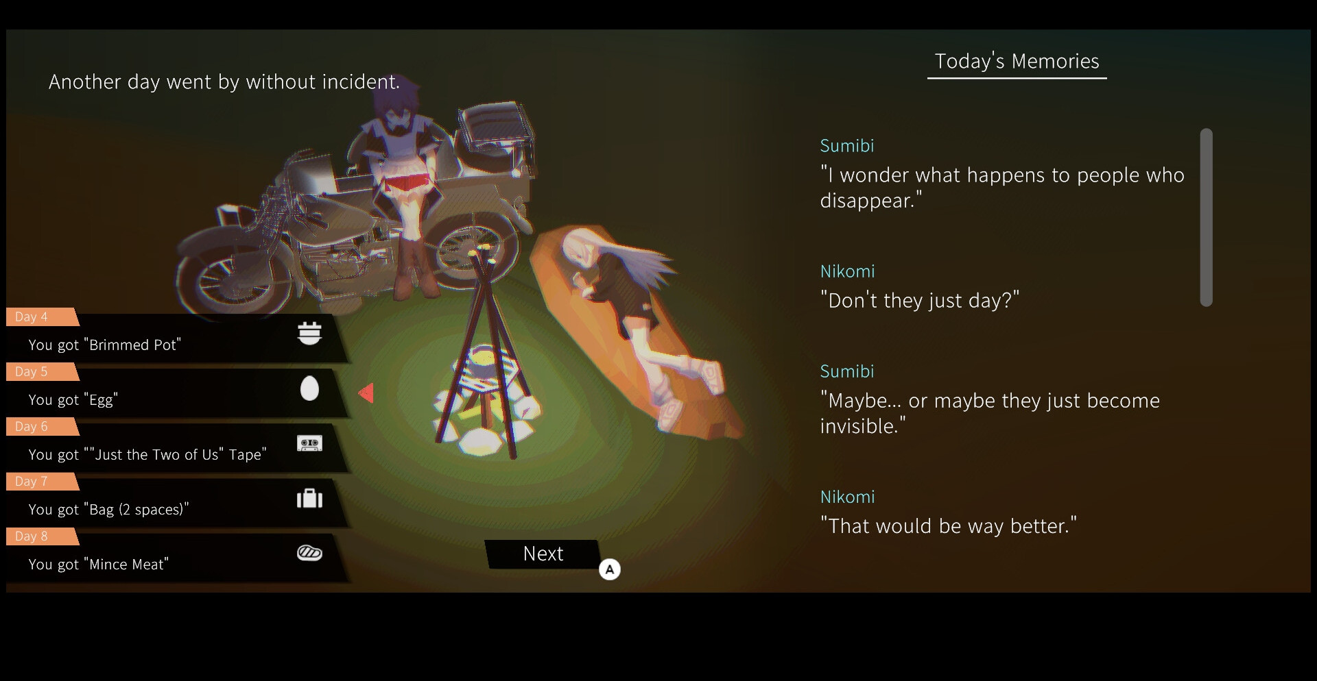 Сумиби и Никоми отправляются в путешествие по миру, где исчезновение стало нормой. Вместе они исследуют заброшенные города, собирают ингредиенты для приготовления еды и продолжают путь, чтобы не исчезнуть самим. В отличие от большинства игр, здесь сюжет раскрывается на дороге: во время движения девушки разговаривают, и вы узнаёте больше о мире и о них самих.