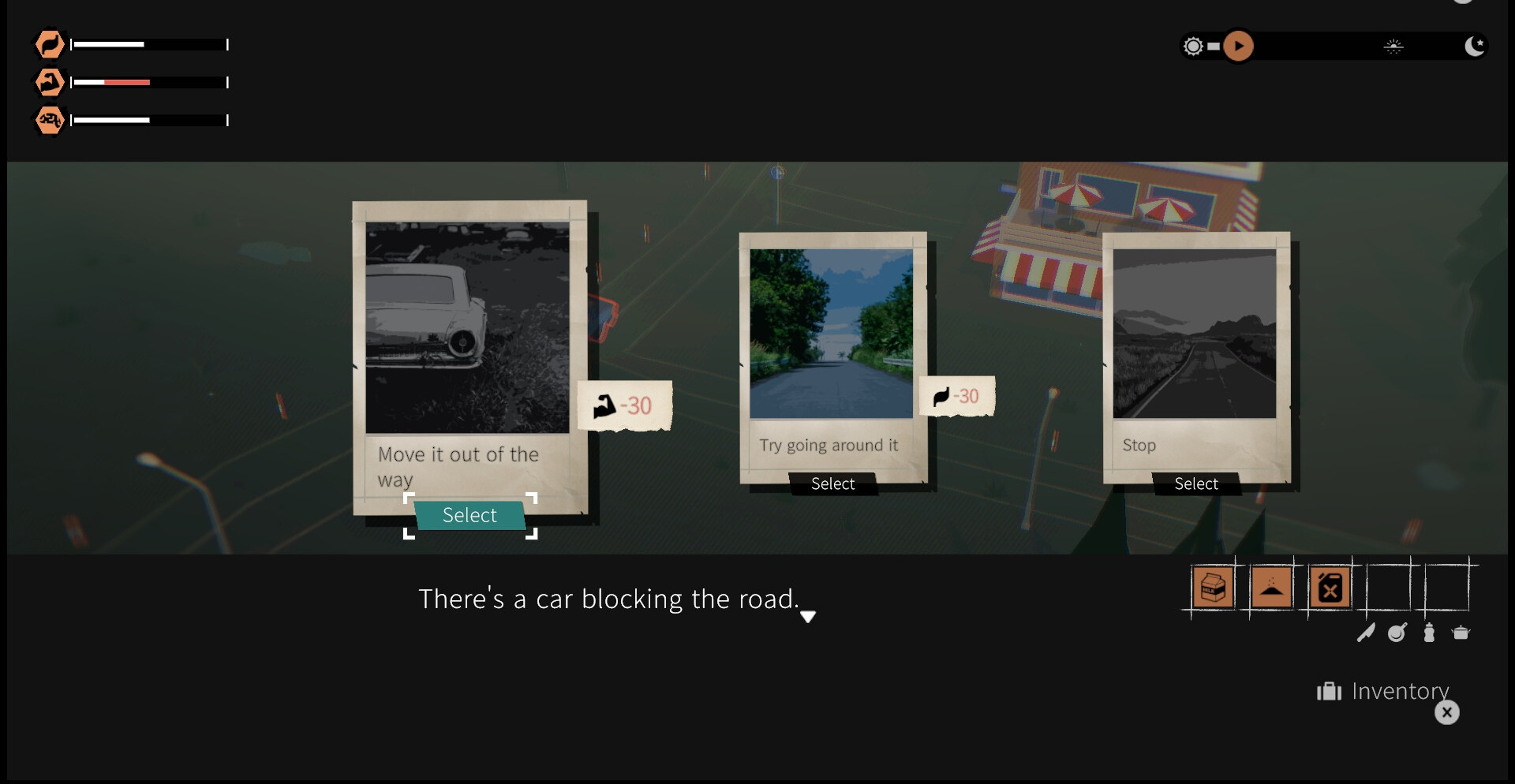 Выбор дороги влияет на развитие сюжета. Каждая развилка может стать началом новой истории, но с каждым километром ресурсы уменьшаются, а приготовление пищи становится жизненно важным. Умение готовить и поддерживать параметры девушек открывает доступ к новым ответвлениям сюжета.