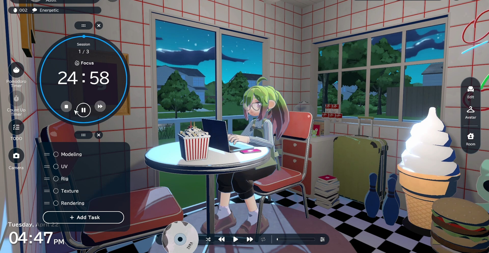 Настройте ваш аватар, выбрав его внешний вид, прическу и наряды. Затем создайте пространство, которое будет соответствовать вашему внутреннему состоянию — поставьте мебель, выберите декор и цвета, которые создадут уют и атмосферу спокойствия. С этим инструментом ваш рабочий процесс превращается в гармоничное сочетание труда и отдыха.