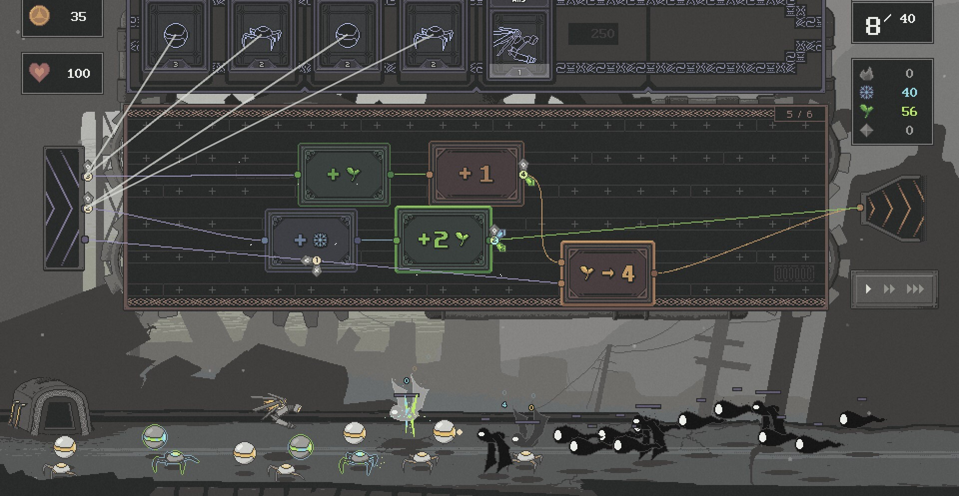 Создание големов начинается с базовых форм, задающих основу их свойств. Комбинирование этих элементов позволяет создавать разные типы автоматонов под конкретные угрозы, что делает систему гибкой и вариативной. Нападения идут волнами, и каждая ошибка в построении цепочки быстро становится заметной. Особенности игры