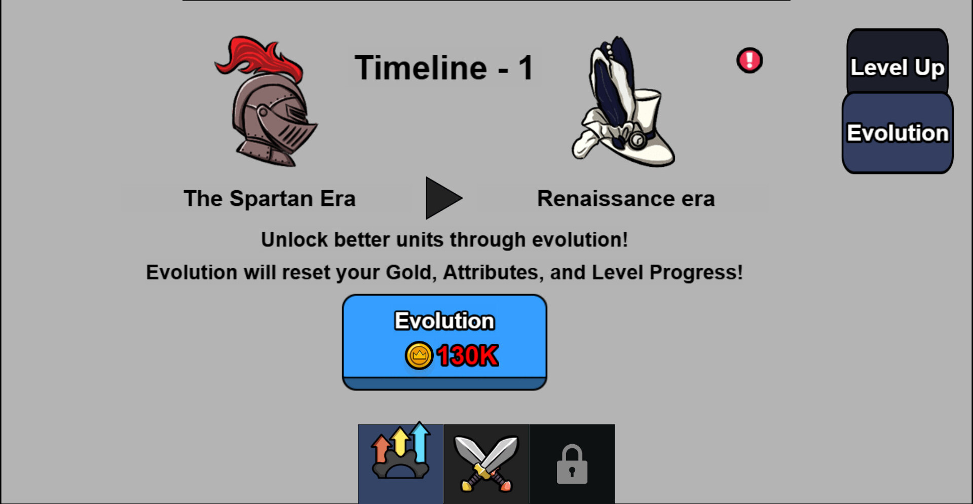Прогрессия через исторические периоды и альтернативные вселенные, где каждая эпоха меняет состав армии, стиль противников и темп боя. Каменный век уступает место Фермерской эпохе, затем Спарте, Возрождению и футуристическому будущему. Дополнительно доступны 16 параллельных миров — от Египта и Троецарствия до Викингов, Роботов и Дикого Запада — формируя 108 уникальных комбинаций цивилизаций и юнитов.