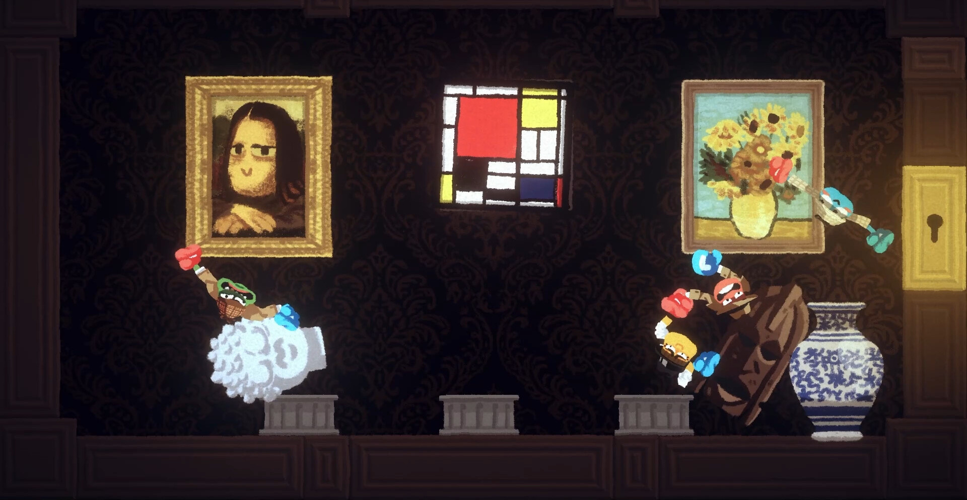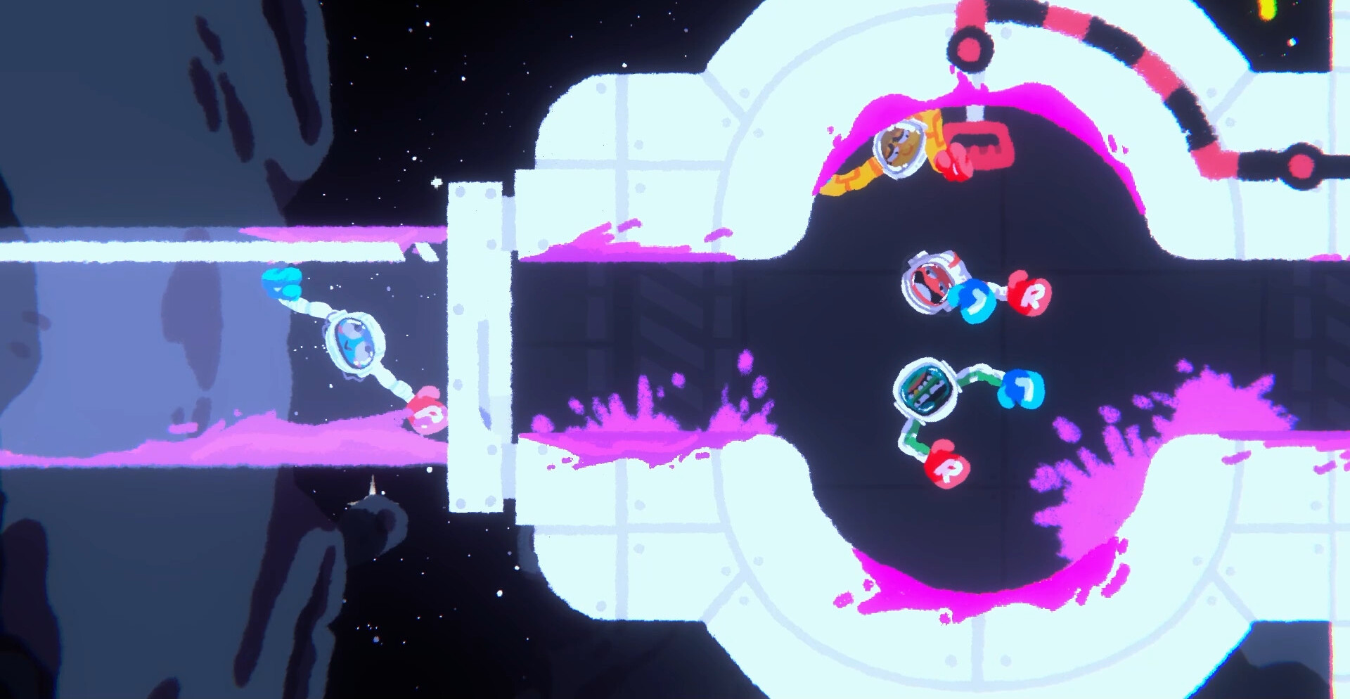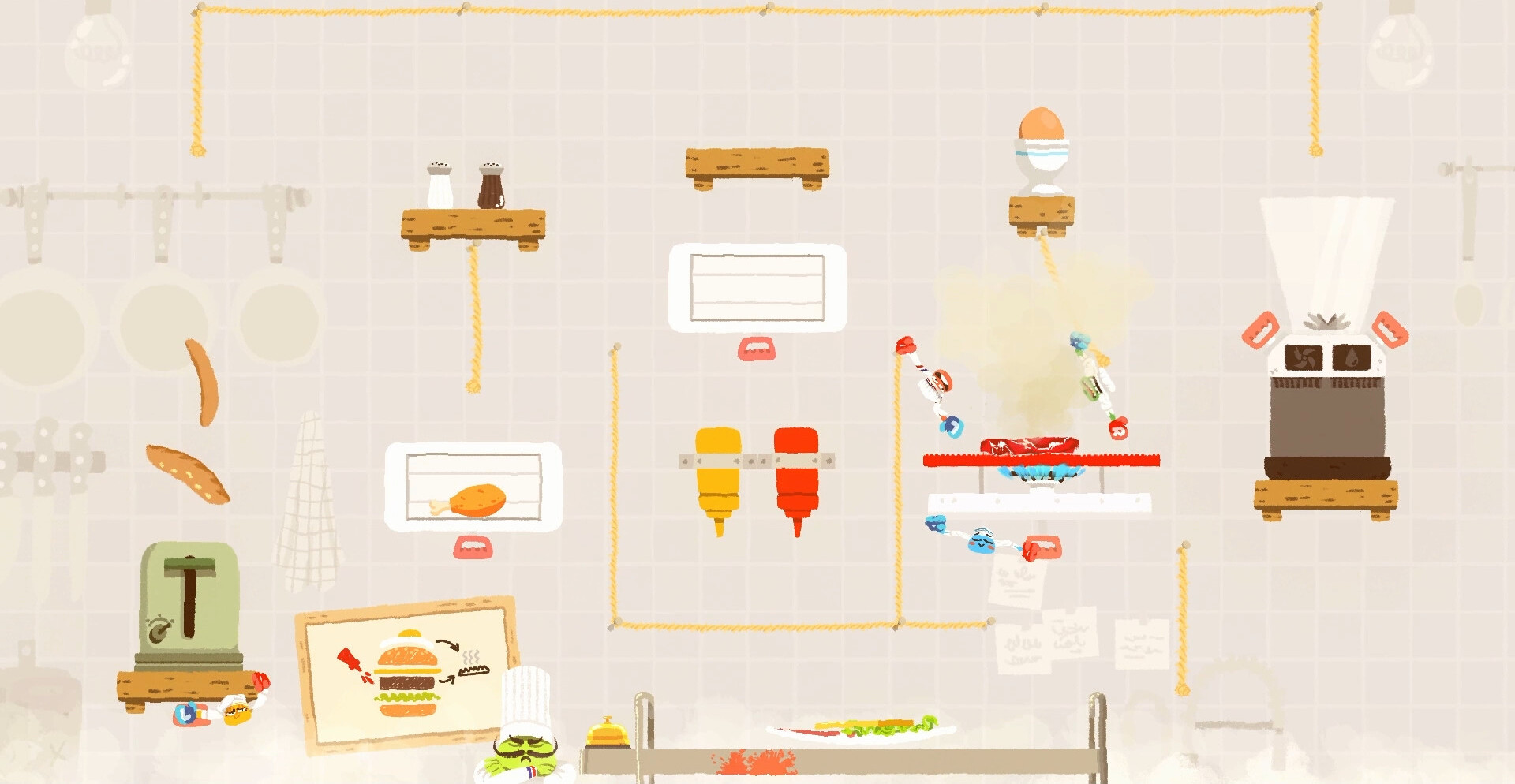 Миры игры наполнены странными устройствами, ловушками и предметами, которые постоянно меняют привычный ход прохождения. На уровнях встречаются дроны, игрушечные ружья, подвижные платформы и другие объекты, влияющие на движение. Некоторые из них помогают команде продвигаться дальше, а другие создают полный хаос, из-за которого игроки начинают падать один за другим. Каждый новый этап добавляет ещё больше безумия и неожиданных ситуаций.
