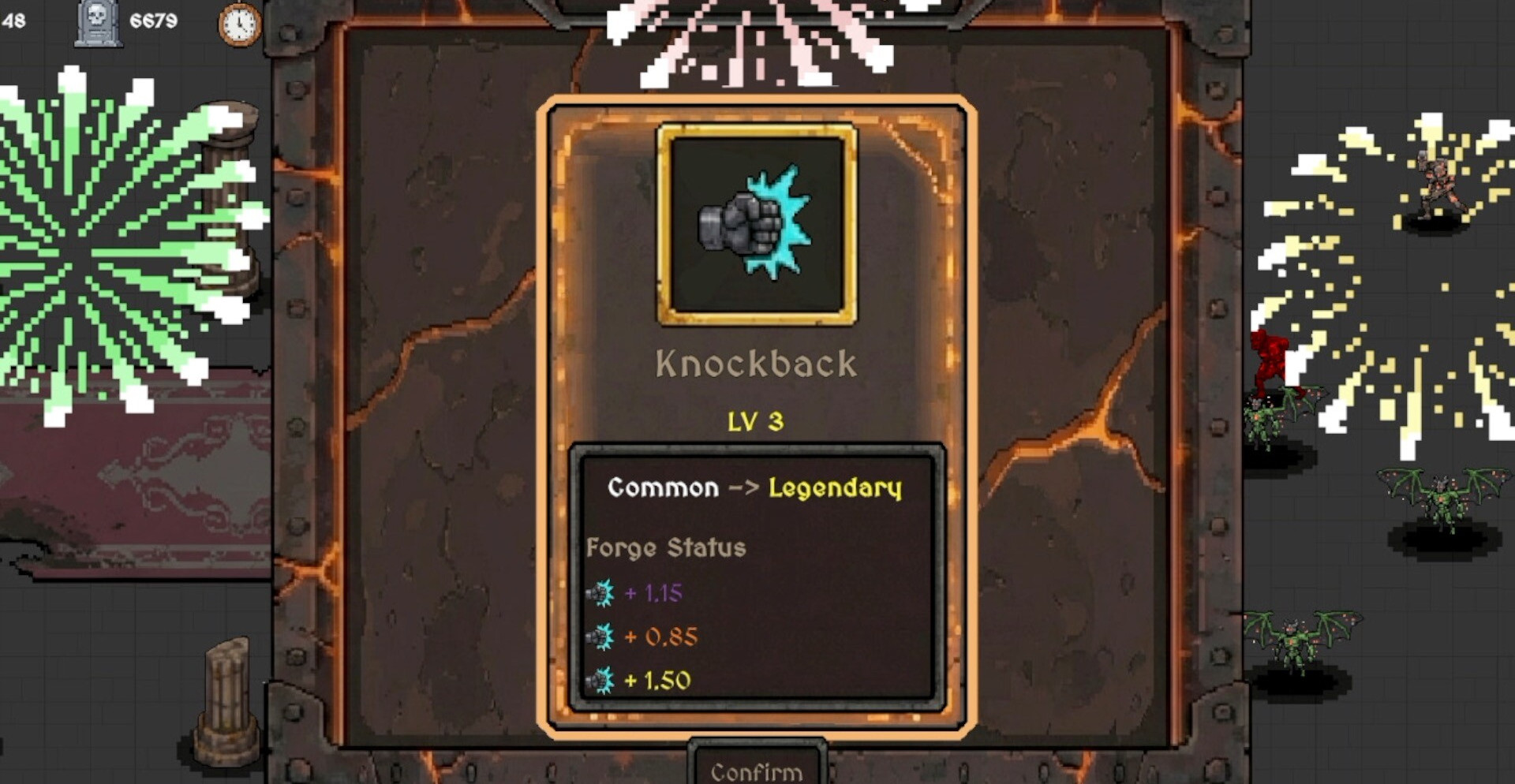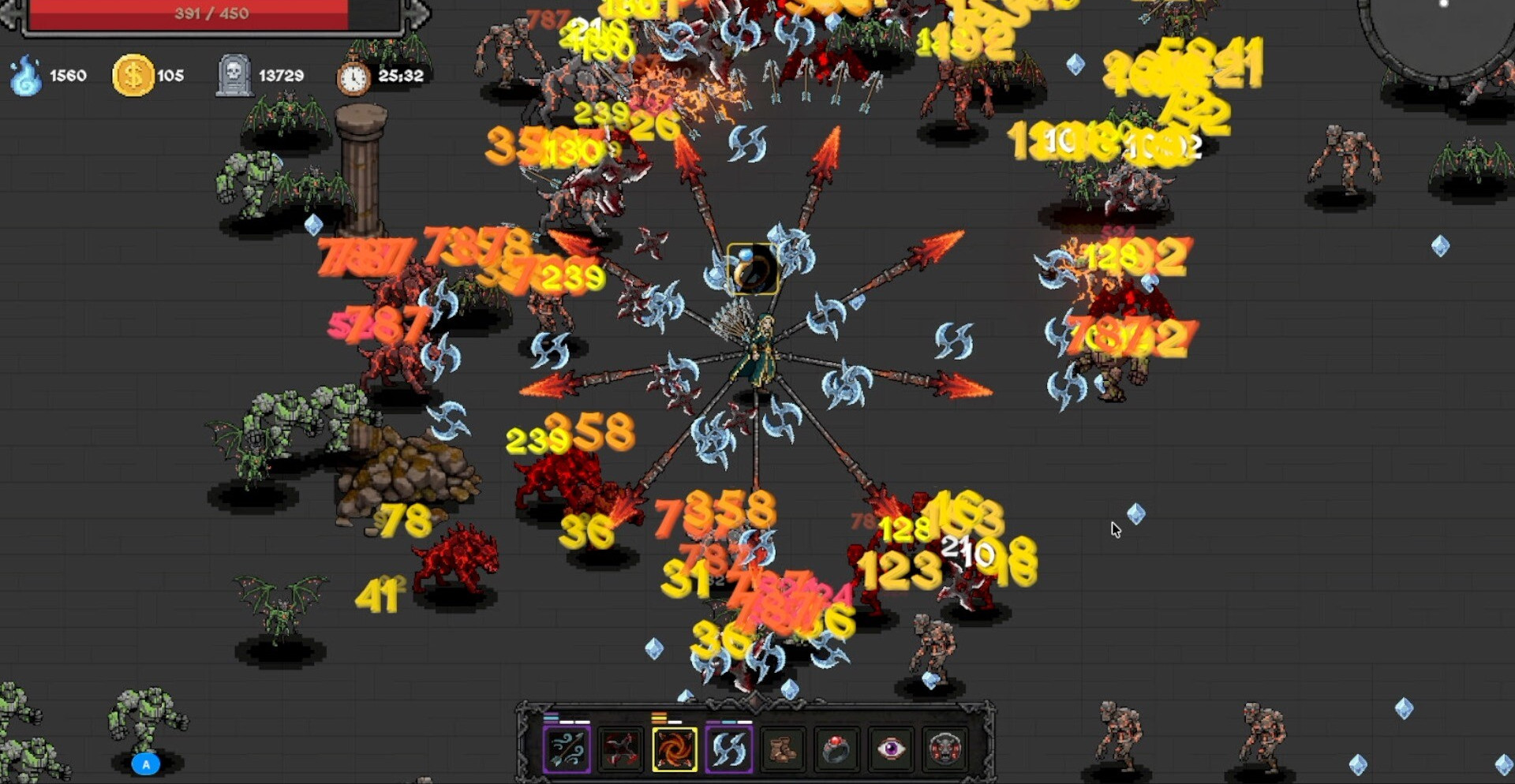 Сражения строятся вокруг постоянного движения по карте и охоты за душами врагов. Чем больше монстров уничтожено, тем выше шанс создать мощное снаряжение. Однако путь к кузнице всегда проходит через плотные ряды демонов, и любая задержка может обернуться окружением. Игроку приходится балансировать между жадностью и осторожностью, решая, когда продолжать бой, а когда отступить.