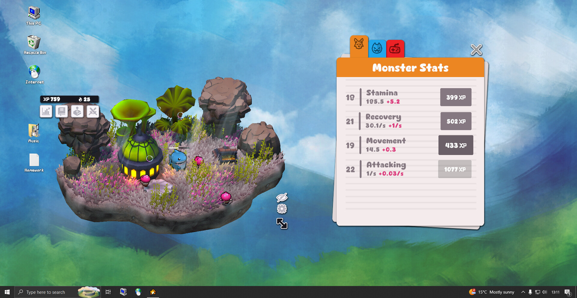 На вашем острове монстры сражаются с другими существами, чтобы получать опыт, используемый как валюта для улучшения характеристик.