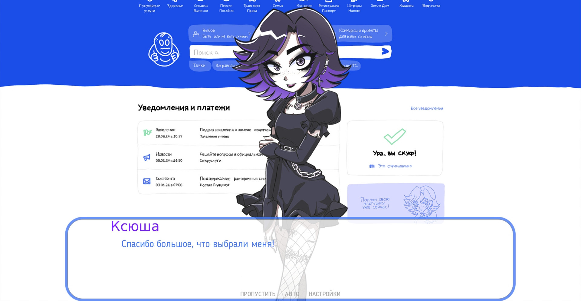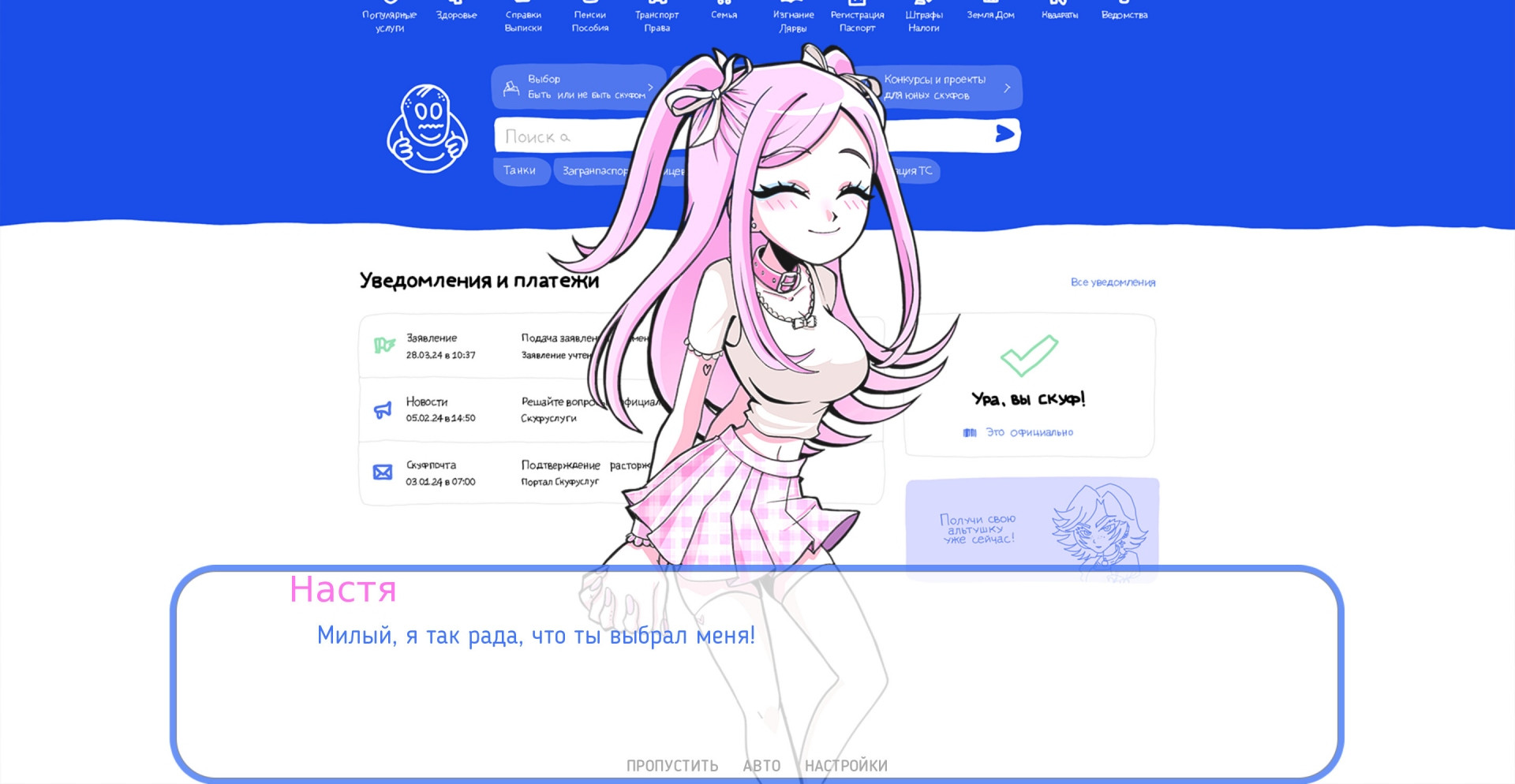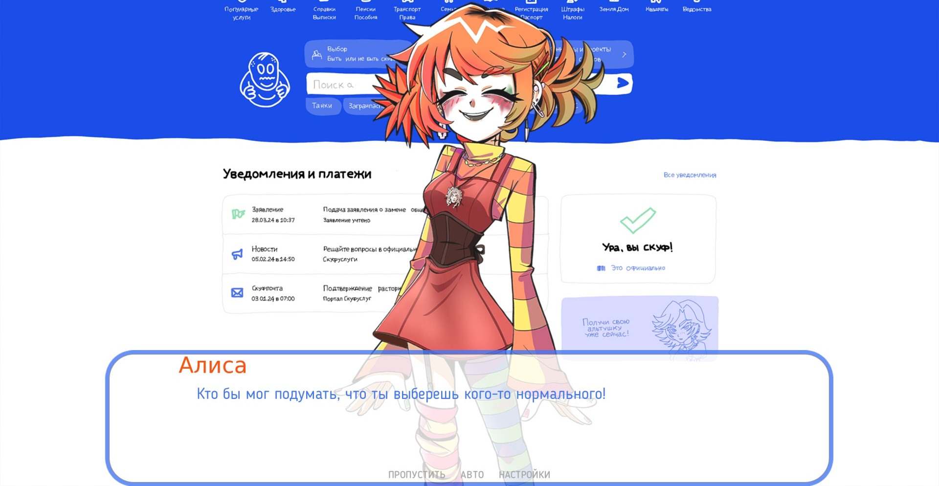 Альтушка для скуфа – ходят слухи, что любому скуфу, государство выдает самую настоящую тяночку. Для этого нужно только зарегистрироваться в специальном сервисе и ввести всю нужную информацию.