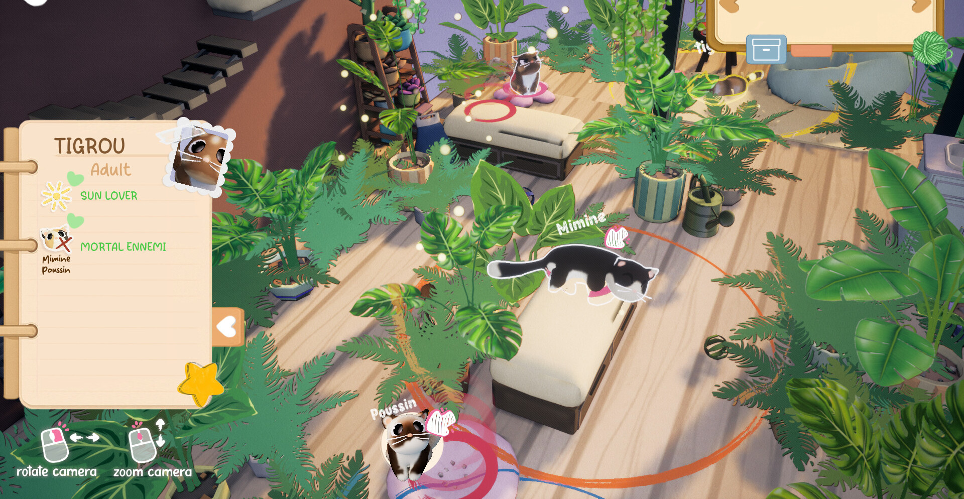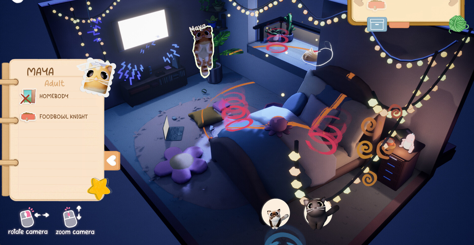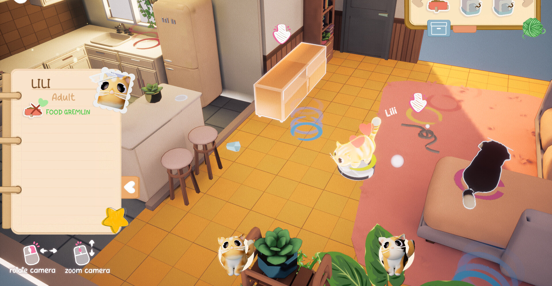 Каждая головоломка строится вокруг поведения кошек и особенностей окружения. Игрок перемещает мебель, открывает новые зоны комнаты и экспериментирует с предметами интерьера. Иногда достаточно сдвинуть стул, иногда — полностью изменить расположение объектов, чтобы удовлетворить капризного питомца и найти правильное решение.