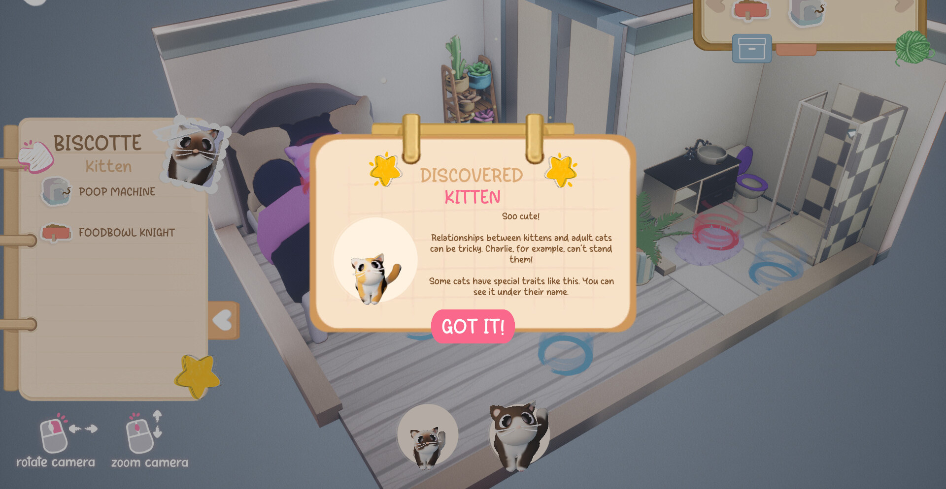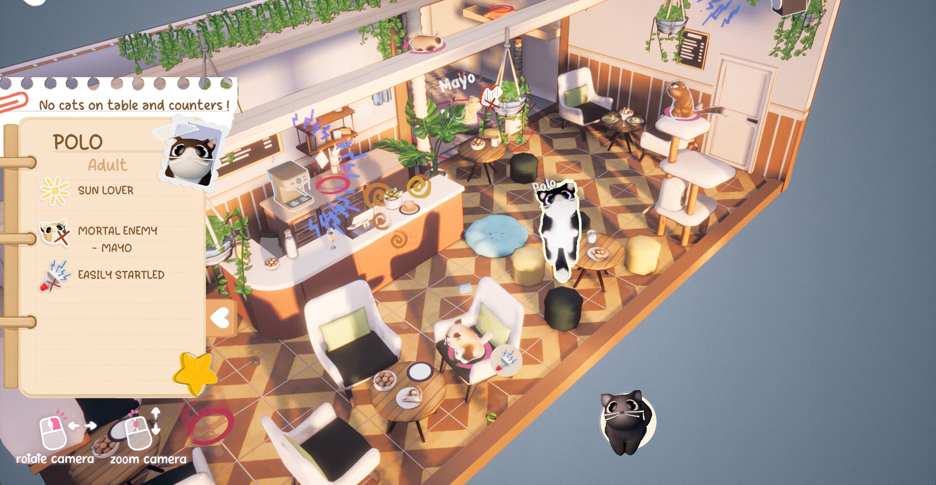 По мере прохождения задачи становятся сложнее и разнообразнее. Новые комнаты предлагают разные условия, необычные ограничения и всё больше кошек с собственными предпочтениями. Постепенно игрок начинает понимать их привычки и характеры, что помогает быстрее находить решения и создавать комфортную атмосферу.