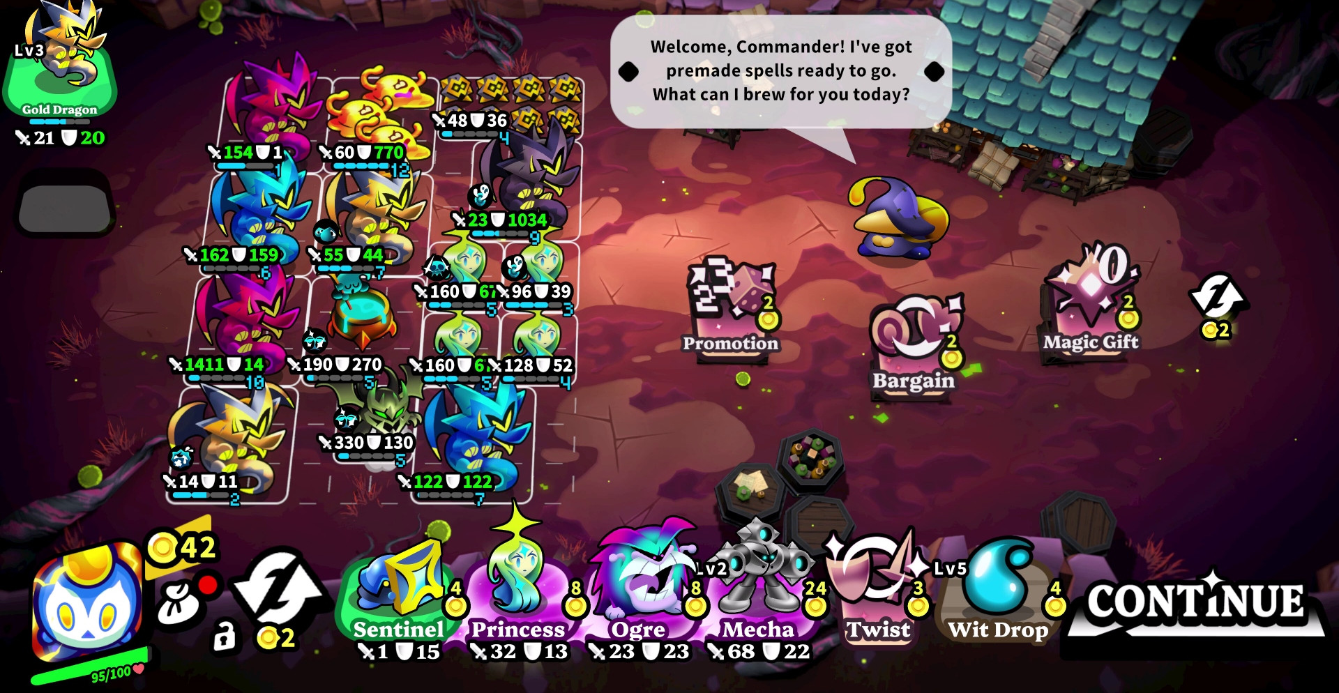 Комбинации отрядов, артефактов и чар.