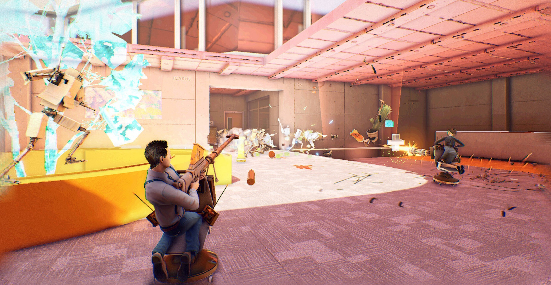 В офисе сидит несколько клерков, и все они одеты в чёрные пиджаки и белые рубашки. Все они сидят на одинаковых зелёных стульях. Концепция Last Man Sitting поначалу кажется крайне скучной для видеоигры. Но стоит добавить сюда дробовики и рэгдолл-физику, как мы получим едва ли не лучшую игру жанра «королевская битва». Вся суть заключается в следующем: несколько людей в маленькой комнате пытаются перестрелять друг друга, каждый раз после выстрела отлетая назад из-за мощной отдачи.