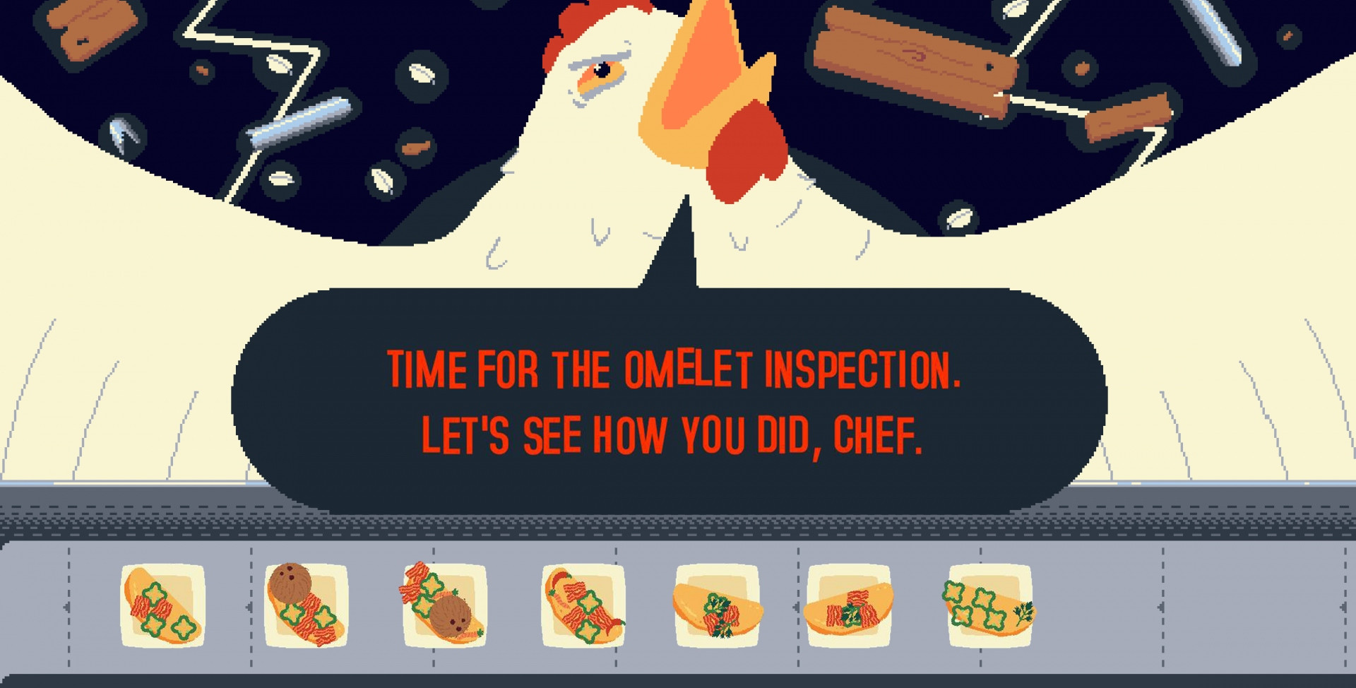 Ингредиенты катятся, как на конвейере судьбы — то авокадо, то кактус, то мороженое. Вы хватаете всё, комбинируете в диком темпе и надеетесь, что клиенту с тараканами в голове понравится ваш «омлет-эксперимент». Каждое блюдо — это вызов, особенно если Директор Кудахт сегодня не в настроении.