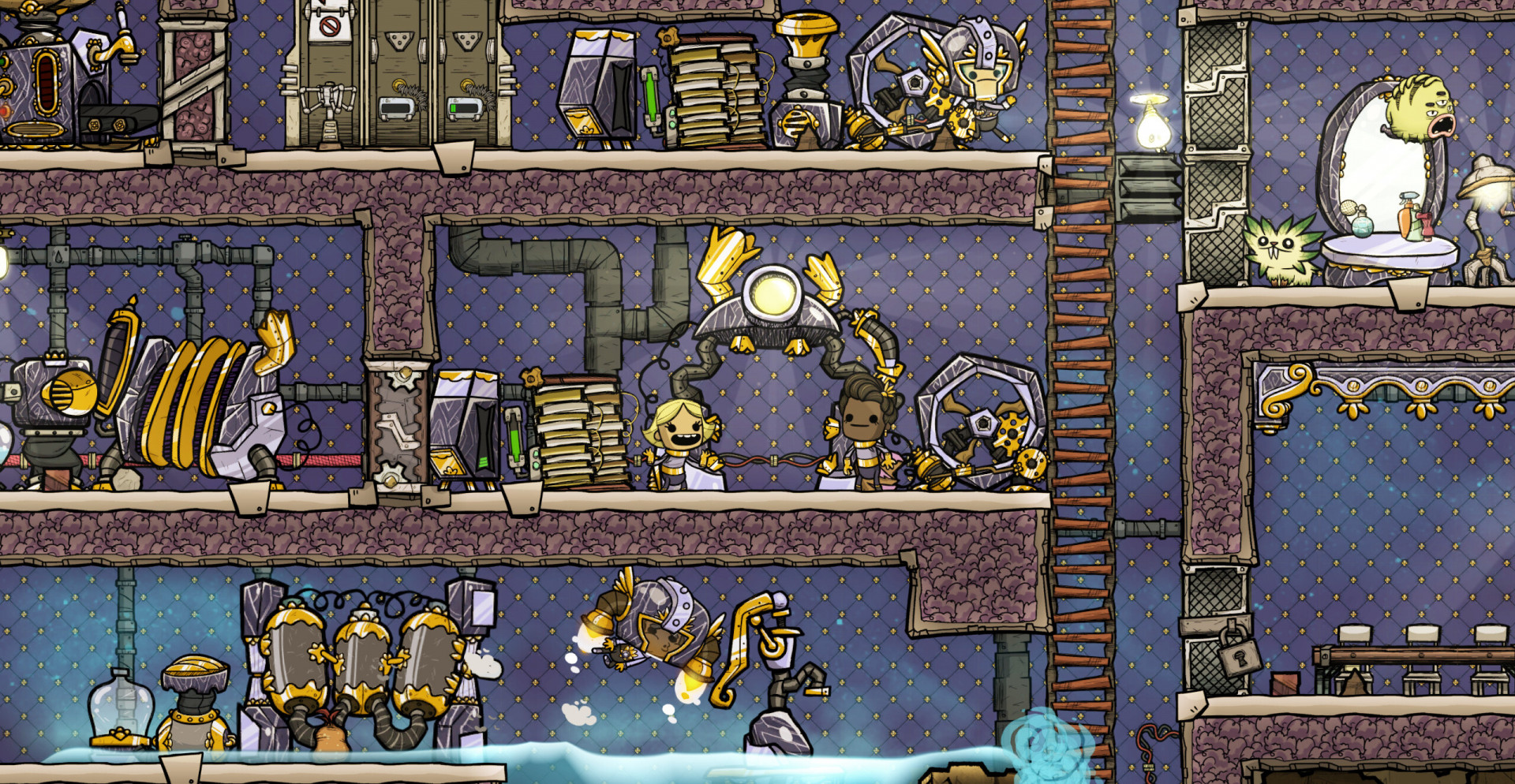 Какое говорящее название — «Кислород не включен»! Не включен не только он — также геймеру потребуется добывать воду и пищу, заботиться об отоплении. Легко догадаться, что действия происходят в космосе, а именно — в подземельях какого-то астероида, который решено заселить людьми. Они здесь, как и вообще всё, выглядят забавно. Наблюдать за действиями персонажей, а вернее руководить ими, предстоит сбоку.