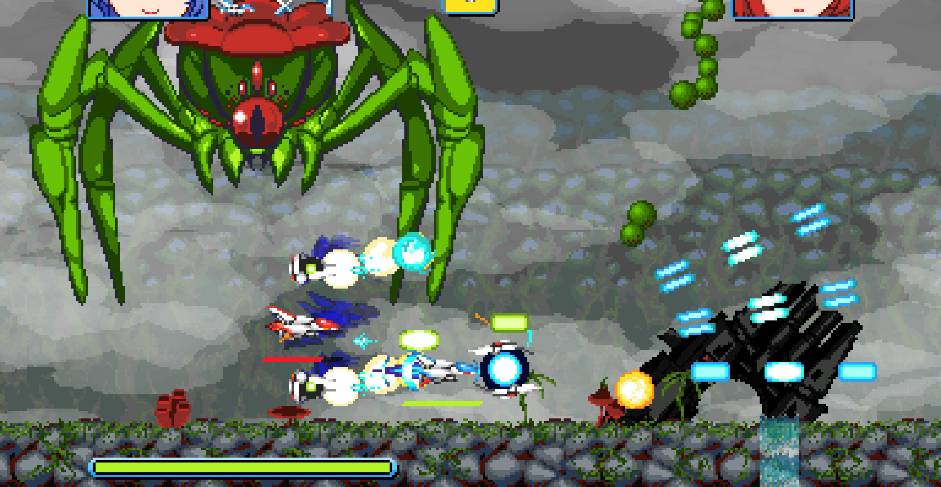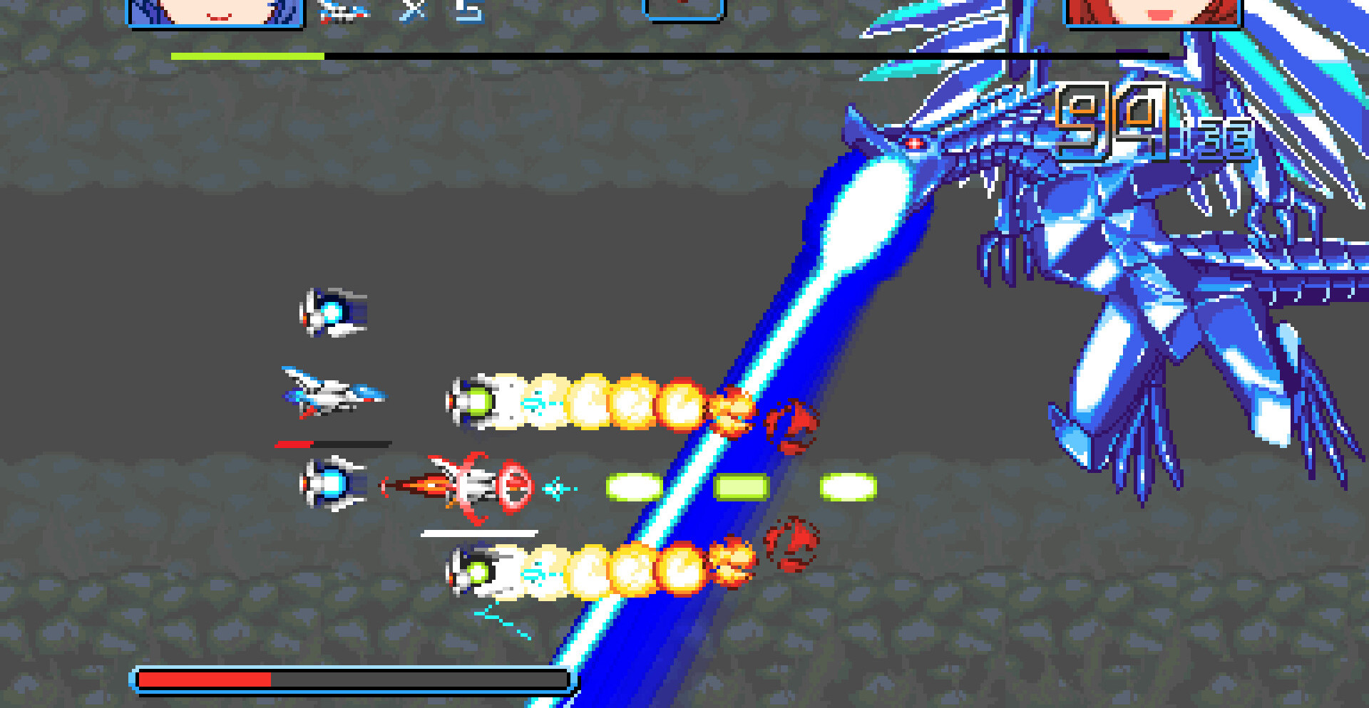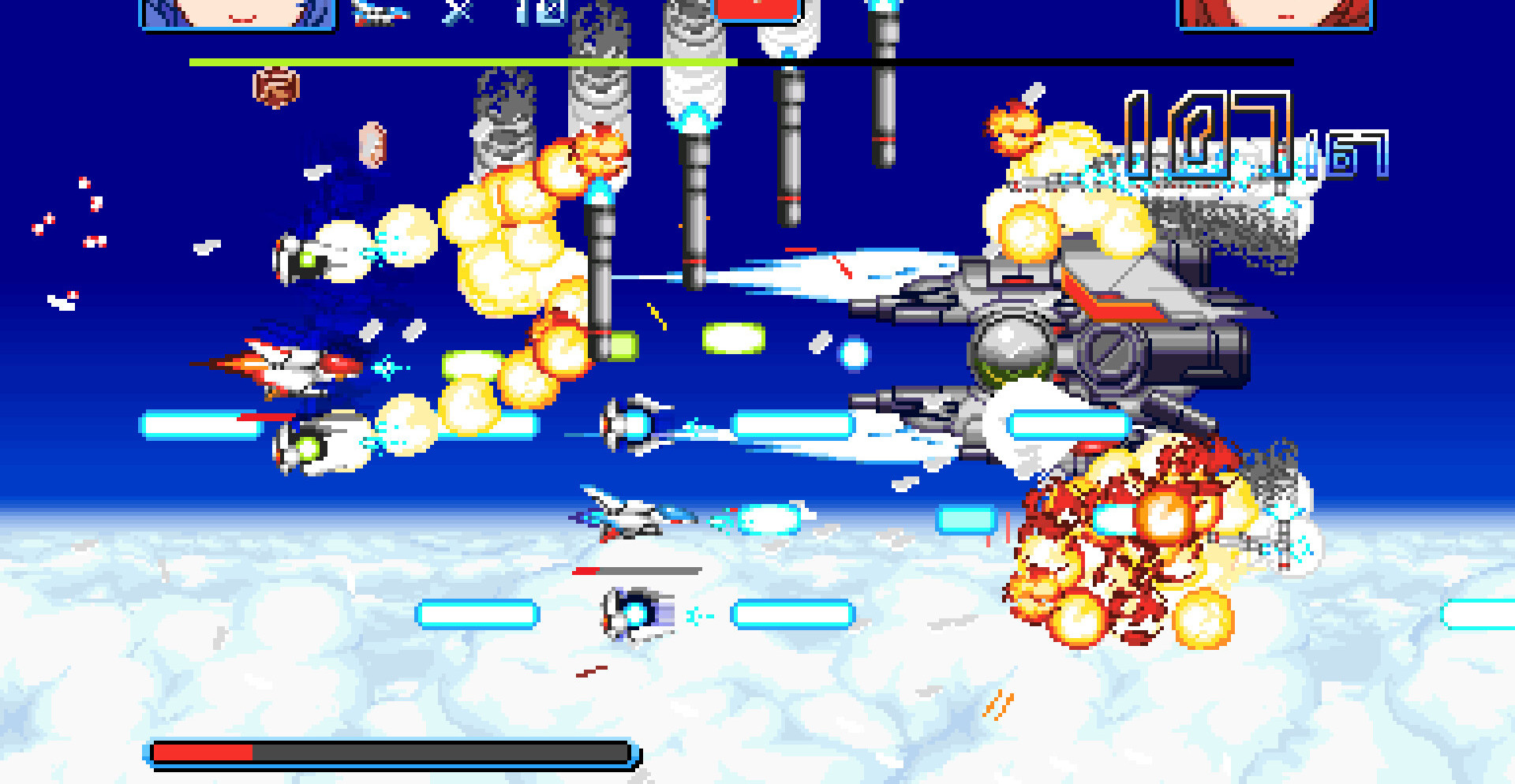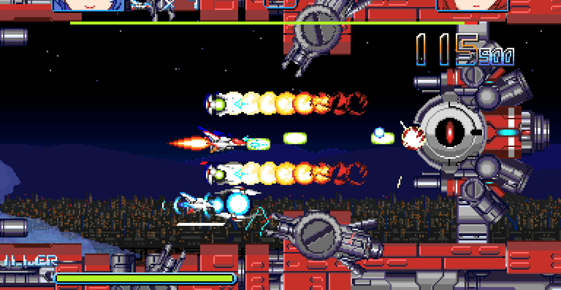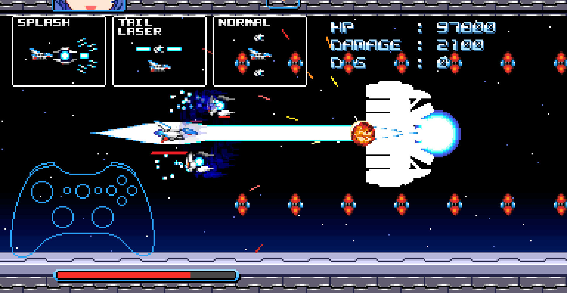 Боевая система строится вокруг гибкой настройки корабля и использования разных типов атак. Bit Shoot позволяет наносить бумеранг-удары, Burst выпускает мощный энергетический луч, а дополнительное вооружение — от огнемётов до лазеров — открывается через прогрессию. Более 2000 комбинаций экипировки дают простор для экспериментов.