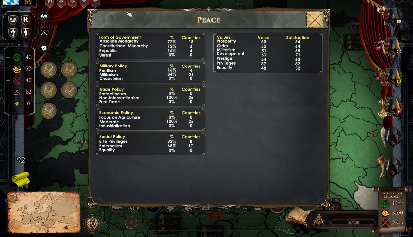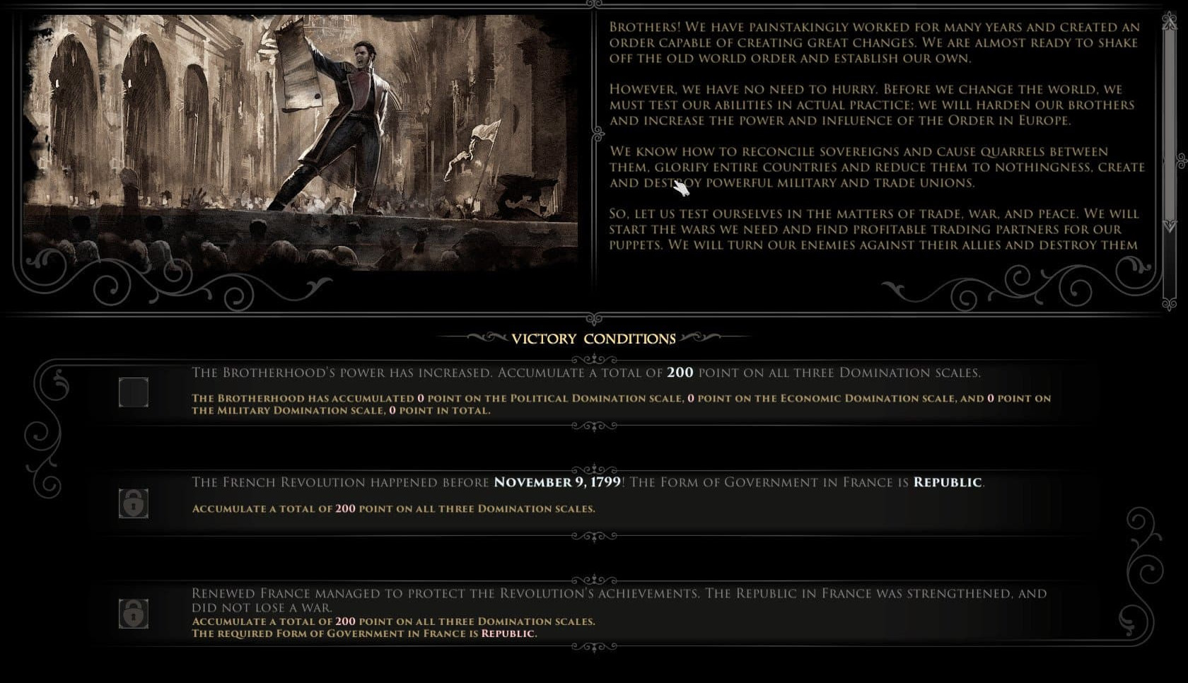Правители стран эгоистичны и заботятся только о надежности своей власти, суверенитете, целостности границ и обогащении. Вам же предстоит вывести сложившуюся систему из равновесия и, вероятно, запустить критические процессы для проведения необходимых перемен. Вы не сможете навязать свою волю – управляйте незаметно и скрытно с помощью агентов.