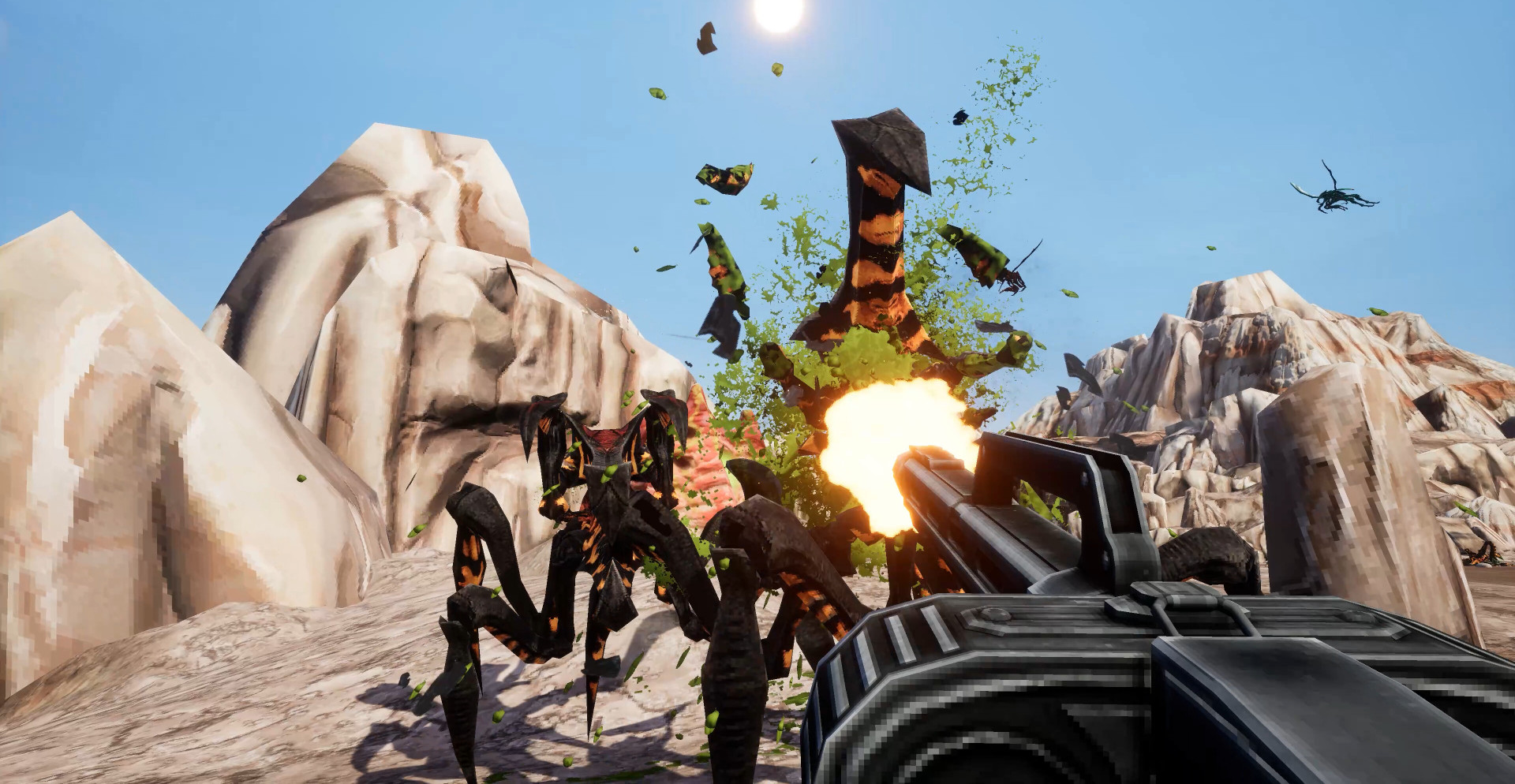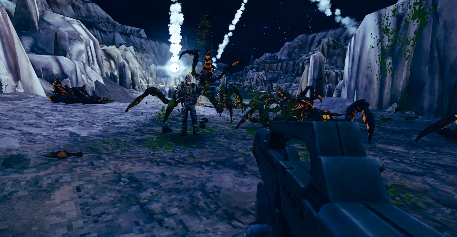 Кампания разворачивается как серия масштабных симуляций, где каждая миссия проверяет боевые навыки, ориентацию на местности и умение выживать под давлением. Огромные поля сражений наполнены секретами, дополнительными задачами и бесконечными ордами жуков. Прогресс строится вокруг освоения оружия и понимания поведения противника, а не упрощённых механик.