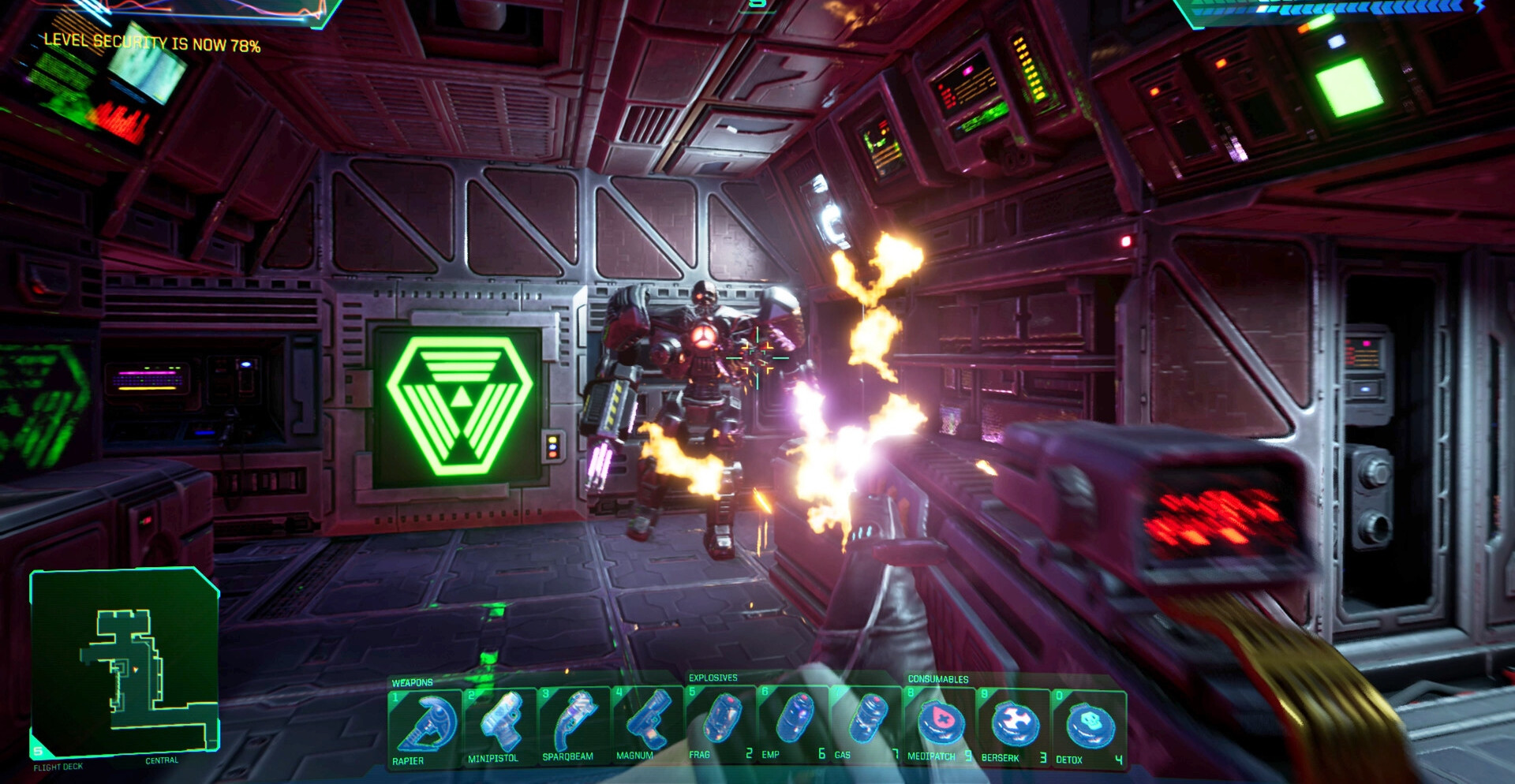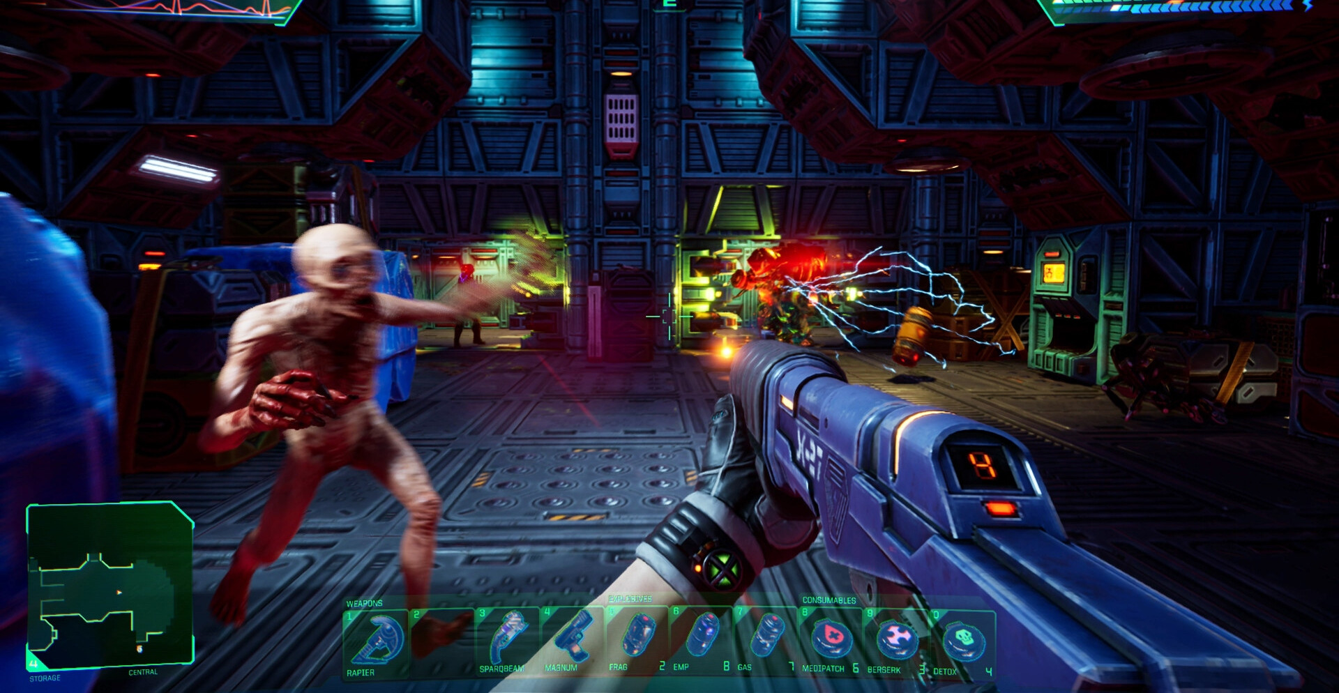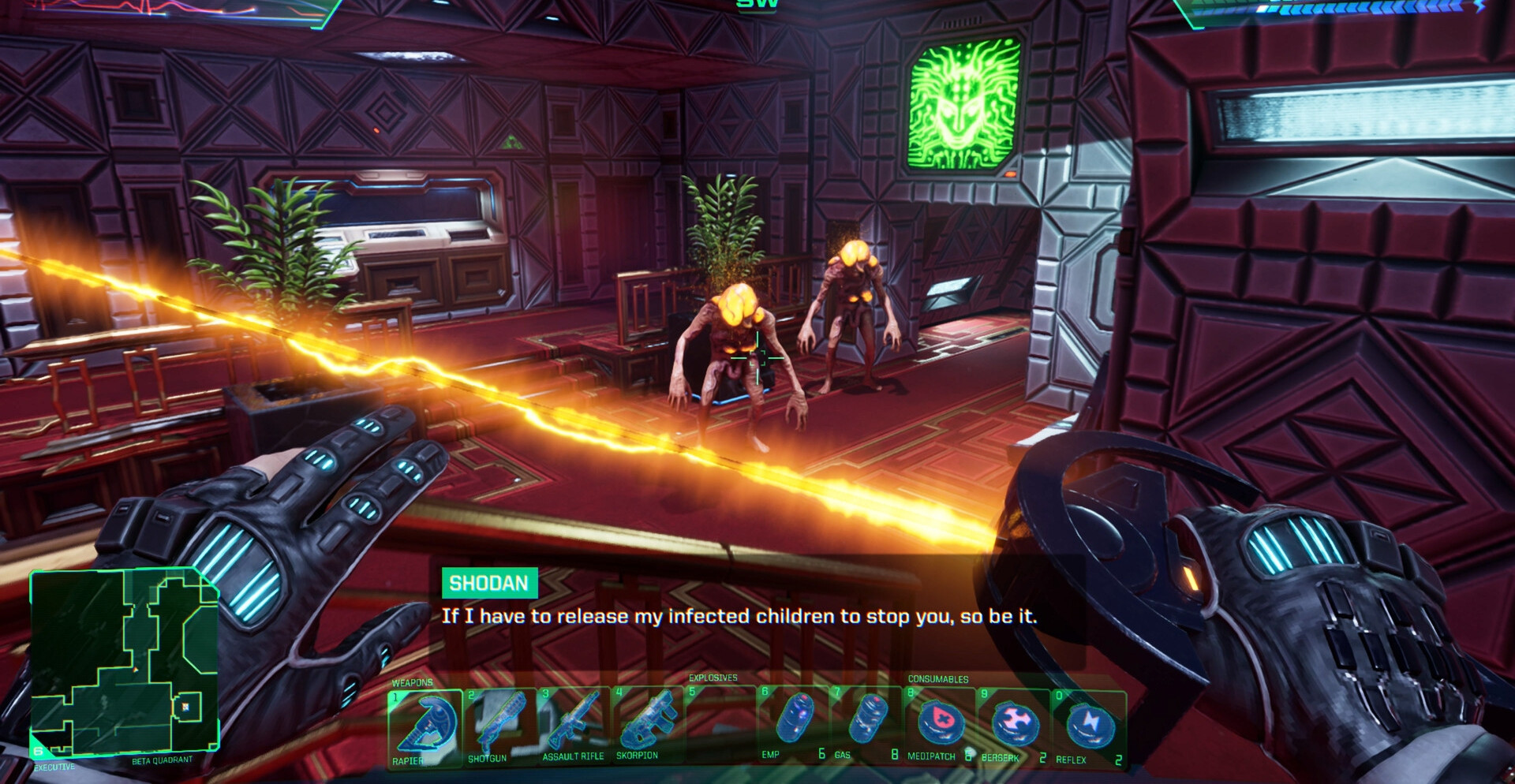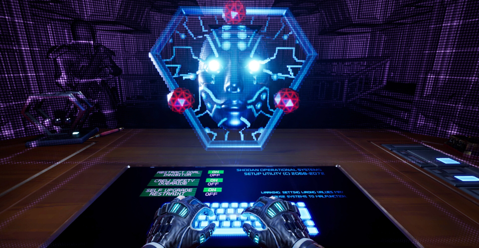 В сюжете присутствует недружелюбный искусственный интеллект - SHODAN, который постоянно так и норовит подставить пользователю разные ловушки и блокирует ему все дороги. Также наличие компьютерных терминалов, помогающие войти в киберпространство, где вы двигаетесь в невесомости, вступая в битву против врага. События, имеют некое влияние, например игрок, сможет открыть двери только будучи в киберпостранстве. Вам предоставляются максимум семь типов оружия, созданных для сражений с роботами, киборгами и монстрами. Пистолет-дарст стреляет иглами и транквилизаторами. Еще, вы можете собирать кожные пластыри, обеспечивающие заживление или ускорение атаки, но могут вызвать усталость и неточность в различении цветов. Ваш арсенал пополнится аптечкой первой необходимости, энергетическими щитами и необходимыми фонарями