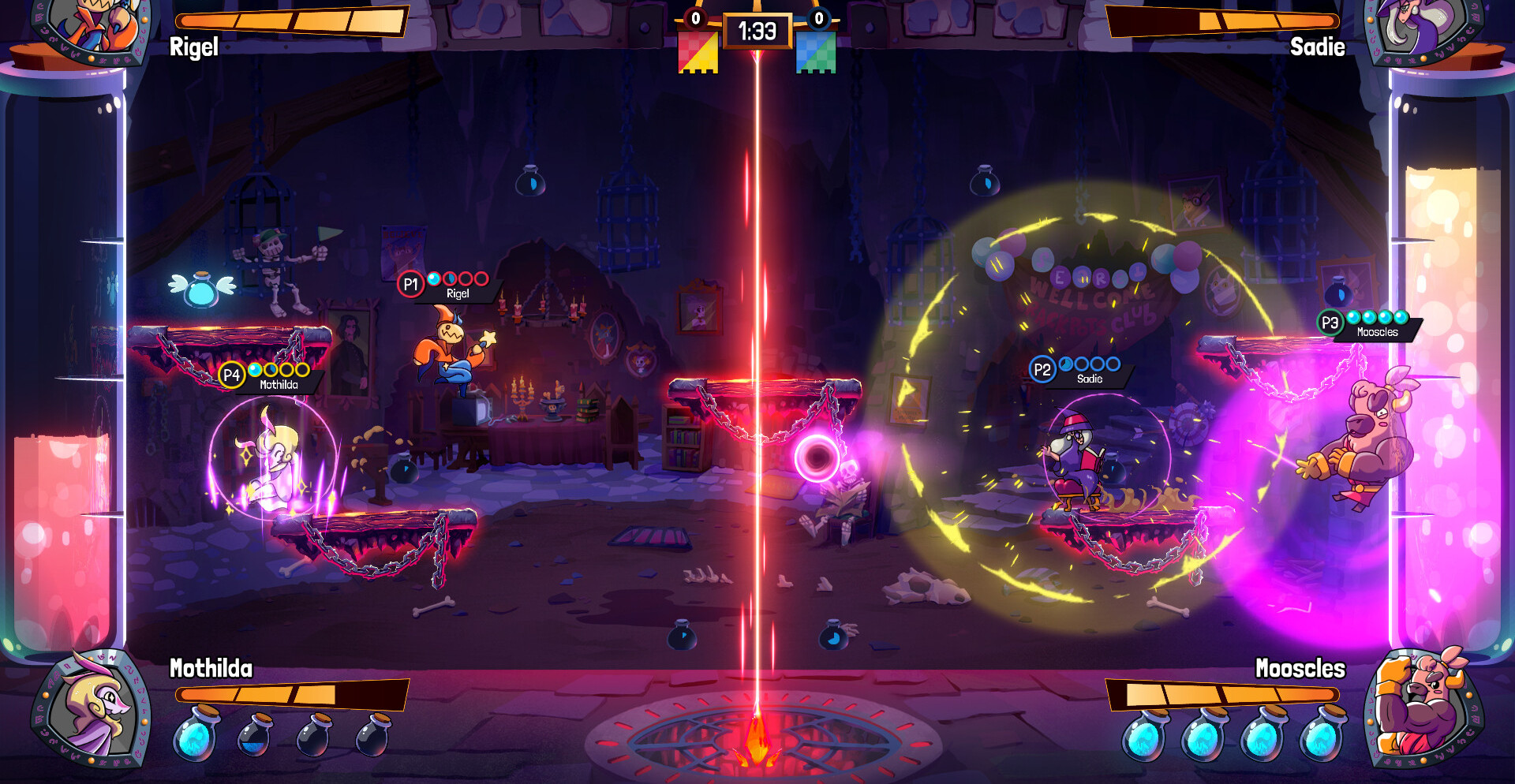 The Amazing Crackpots Club — это дуэльная магическая арена для четырёх игроков, где безумные чародеи сражаются за уничтожение колбы противника. Задача проста: разрушить чужую гигантскую ёмкость с зельем и одновременно сохранить свою. Локальные баталии и онлайн-матчи превращают противостояние в напряжённый магический спорт.