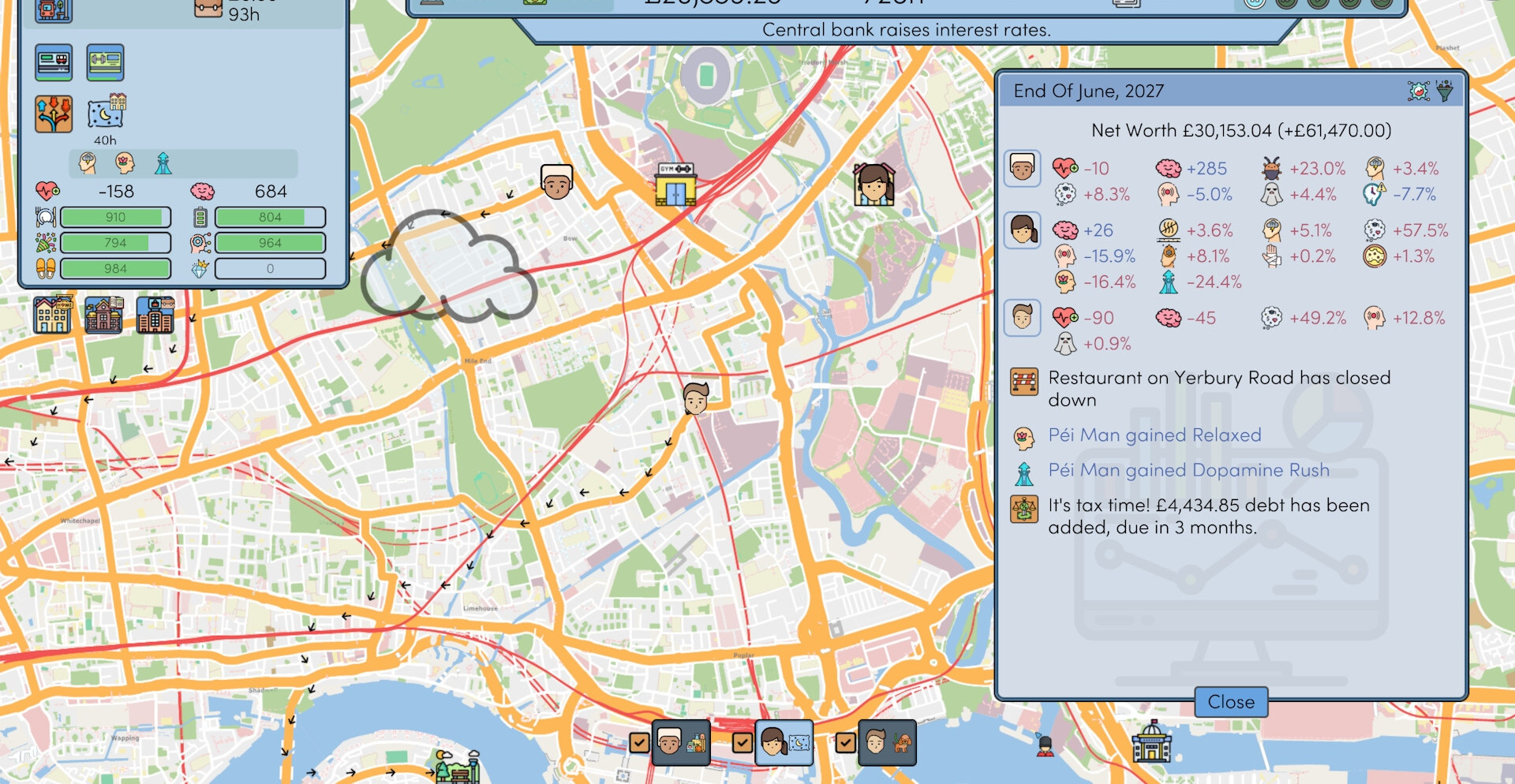 Вы сами формируете стиль жизни героев: определяете, чем они займутся сегодня, и наблюдаете, как рынок вносит свои коррективы. Производство может внезапно стать золотой жилой, а коммунальные расходы — неожиданно упасть. Каждый цикл приносит новые вызовы: от роста цен до спадов в отраслях.