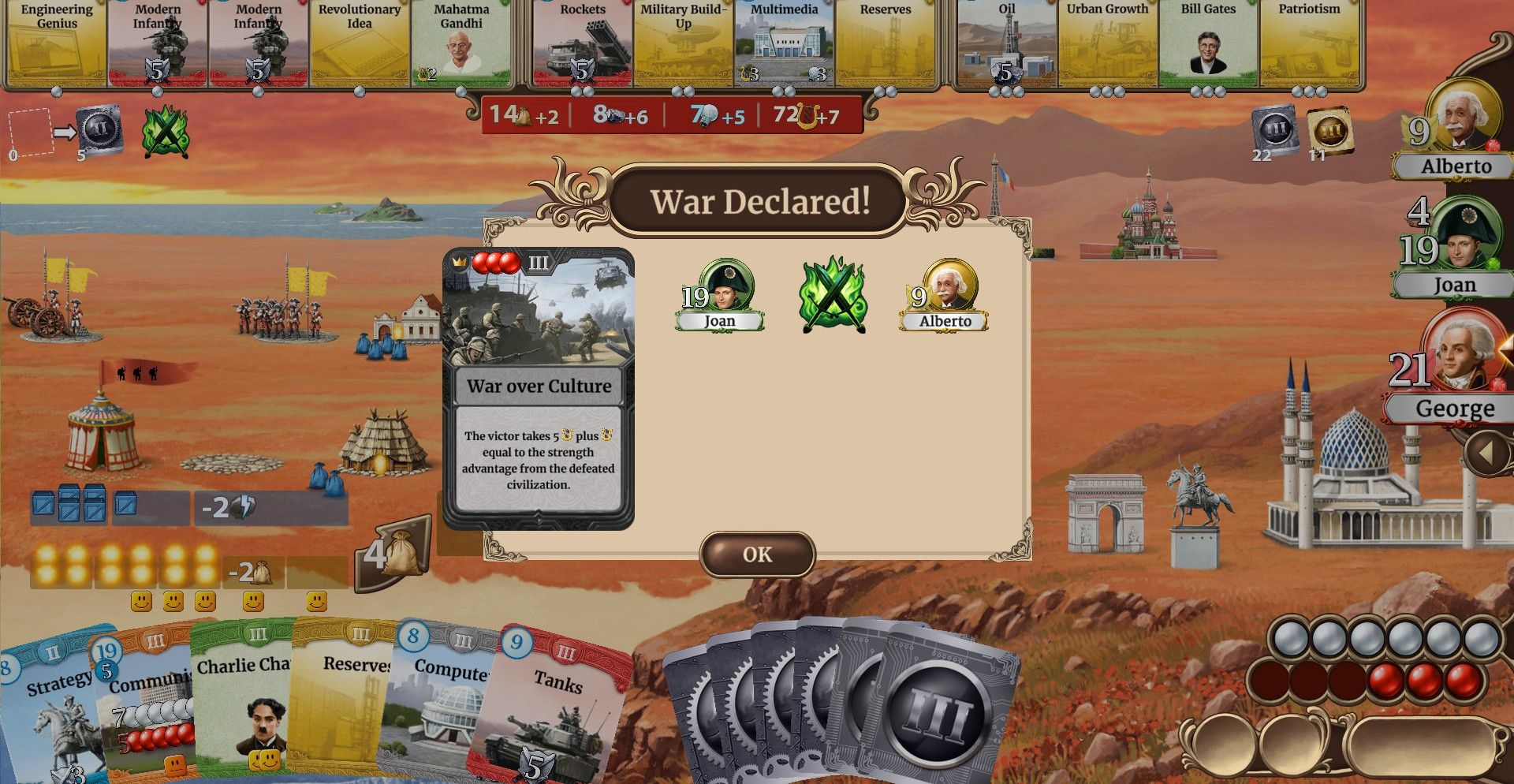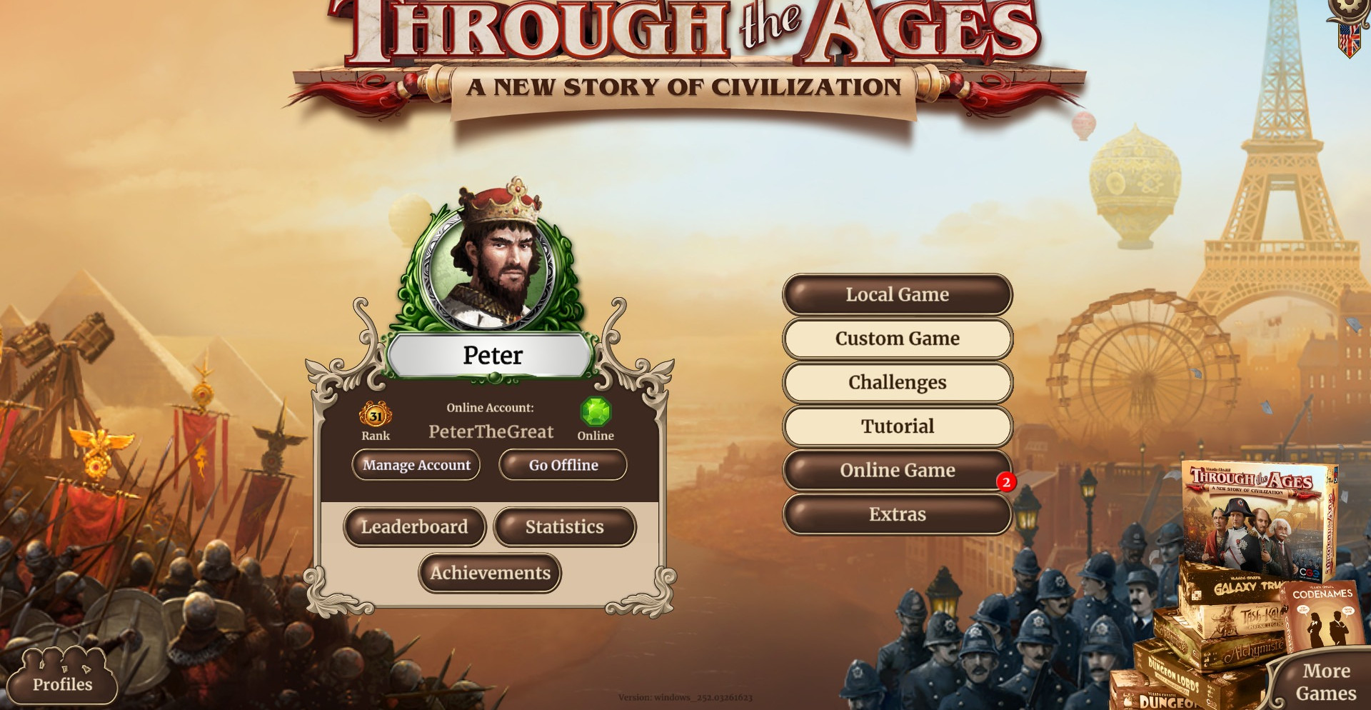 Разработчики создали прекрасно продуманную карточную систему управления. У вас будет очень много карт, каждая из которых по-своему сможет повлиять на исход событий. Например, одна из них может обрести новое чудо света, другая – захватить новые земли, третья – поменять политику в государстве, четвертая подарит невероятный бонус. Вариантов развития событий просто неимоверное количество. У нас вы можете скачать Through the Ages через торрент на русском языке и наслаждаться игрой.