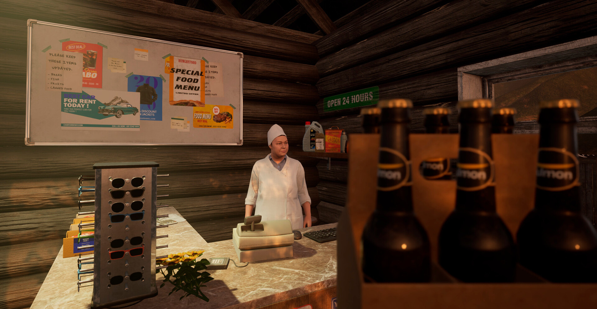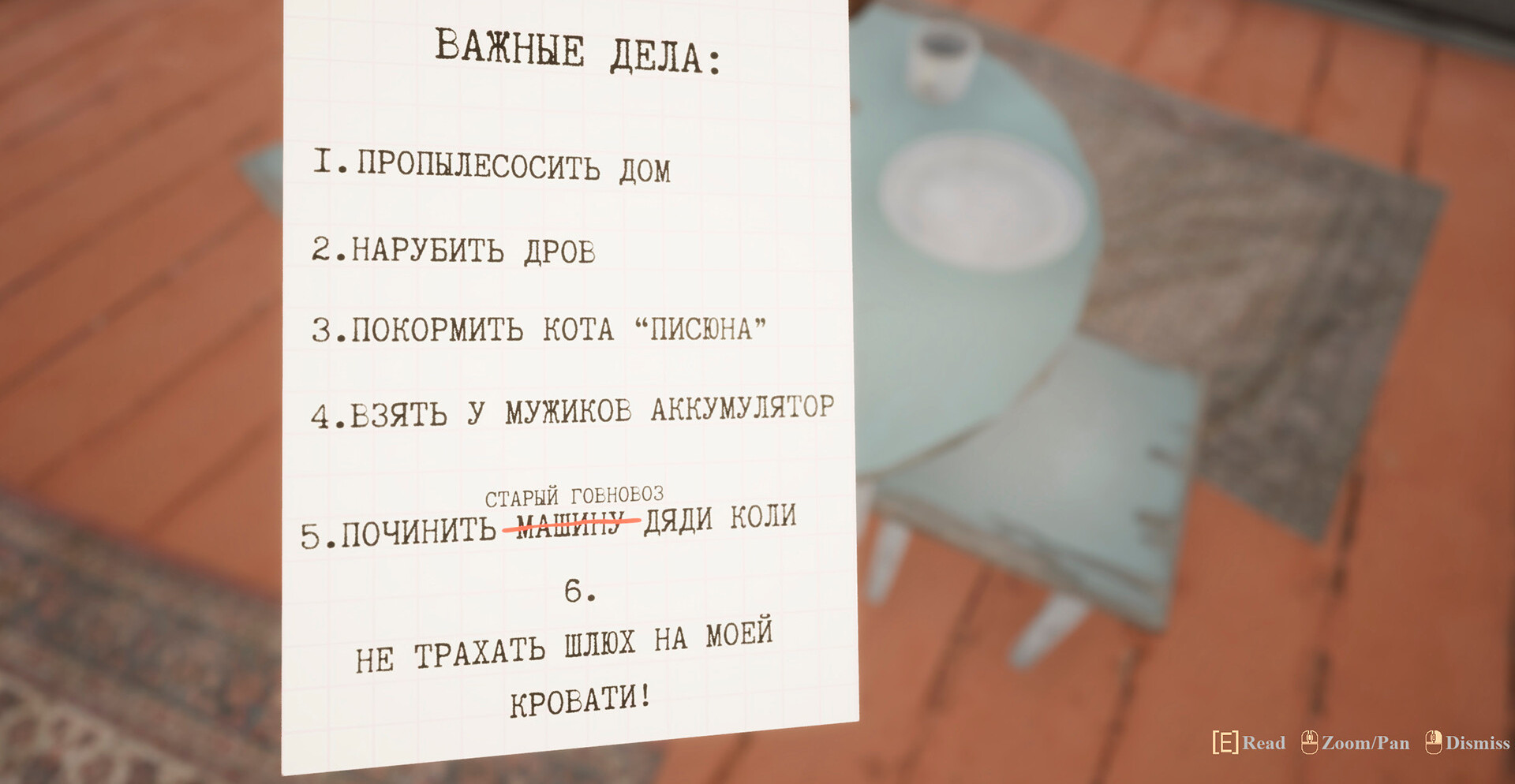 Днём можно шататься по окрестностям, таскать предметы в руках, кормить животных и ввязываться в бытовые абсурдные ситуации. Атмосфера балансирует между бытовым реализмом и намеренной нелепостью, где каждая сцена слегка перегибает палку. Знакомые ассеты и намеренно грубая подача создают эффект странного сна на движке Unreal Engine 5.